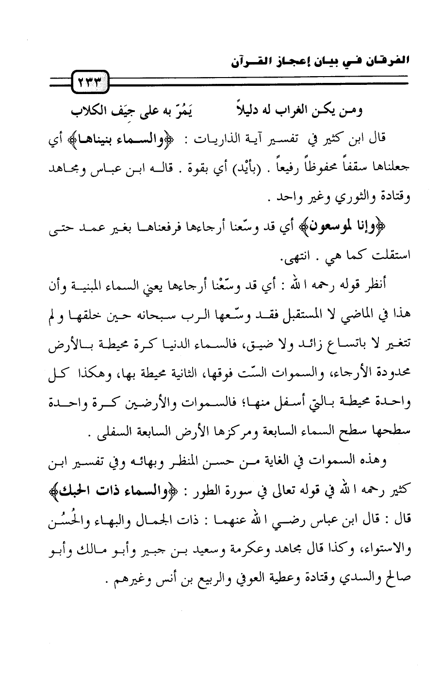 انظر قوله رحمه الله: أي قد وسّعْنا أرجاءها يعني السماء المبنية وأن هذا في الماضي لا المستقبل فقد وسّعها الرب سبحانه حين خلقها ولم تتغير لا باتساع زائد ولا ضيق، فالسماء الدنيا كرة محيطة بها، وهكذا كل واحدة محيطة بالتي أسفل منها؛ فالسموات والأرضين كرة واحدة سطحها سطح السماء السابعة ومركزها الأرض السابعة السفلى.