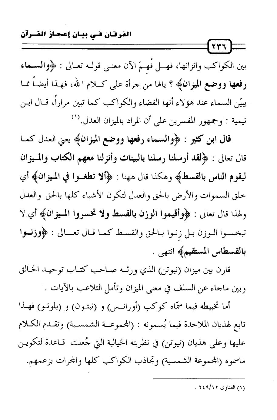 بين الكواكب واتزانها، فهل فُهِمَ الآن معنى قوله تعالى: (وَالسَّمَاءَ رَفَعَهَا وَوَضَعَ الْمِيزَانَ)؟ يا لها من جرأة على كلام الله، فهذا أيضاً مما يبيّن السماء عند هؤلاء أنها الفضاء والكواكب كما تبين مراراً، قال ابن تيمية: وجمهور المفسرين على أن المراد بالميزان العدل (¬1).