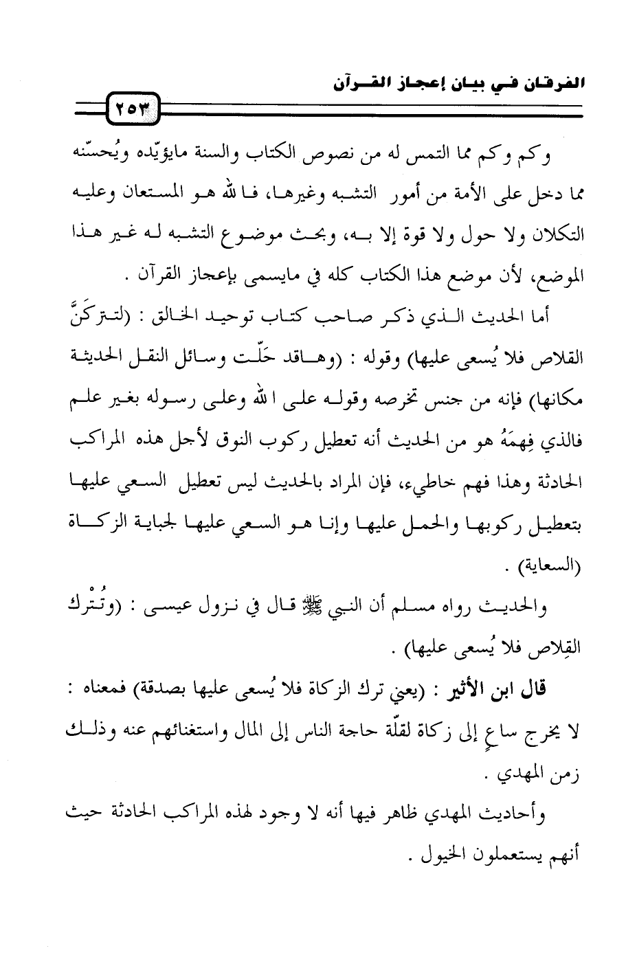 أما الحديث الذي ذكره صاحب كتاب توحيد الخالق: (لتتركَنَّ القلاص فلا يُسعى عليها) وقوله: (وها قد حلَّت وسائل النقل الحديثة مكانها) فإنه من جنس تخرصه وقوله على الله وعلى رسوله بغير علم فالذي فِهمَهُ هو من الحديث أنه تعطيل ركوب النوق لأجل هذه المراكب الحادثة وهذا فهم خاطئ، فإن المراد بالحديث ليس تعطيل السعي عليها بتعطيل ركوبها والحمل عليها وإنما هو السعي عليها لجباية الزكاة (السعاية).