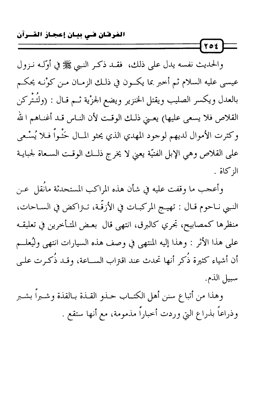 وأعجب ما وقفت عليه في شأن هذه المراكب المستحدثة ما نُقل في الخبر أنه قال: تهيج المركبات في الأزقّة، تتراكض في الساحات، منظرها كمصابيح، تجري كالبرق، انتهى. قال بعض المتأخرين في تعليقه على هذا الأثر: وهذا إليه المنتهى في وصف هذه السيارات انتهى. وليُعلم أن أشياء كثيرة ذُكر أنها تحدث عند اقتراب الساعة، وقد ذُكرت على سبيل الذم.