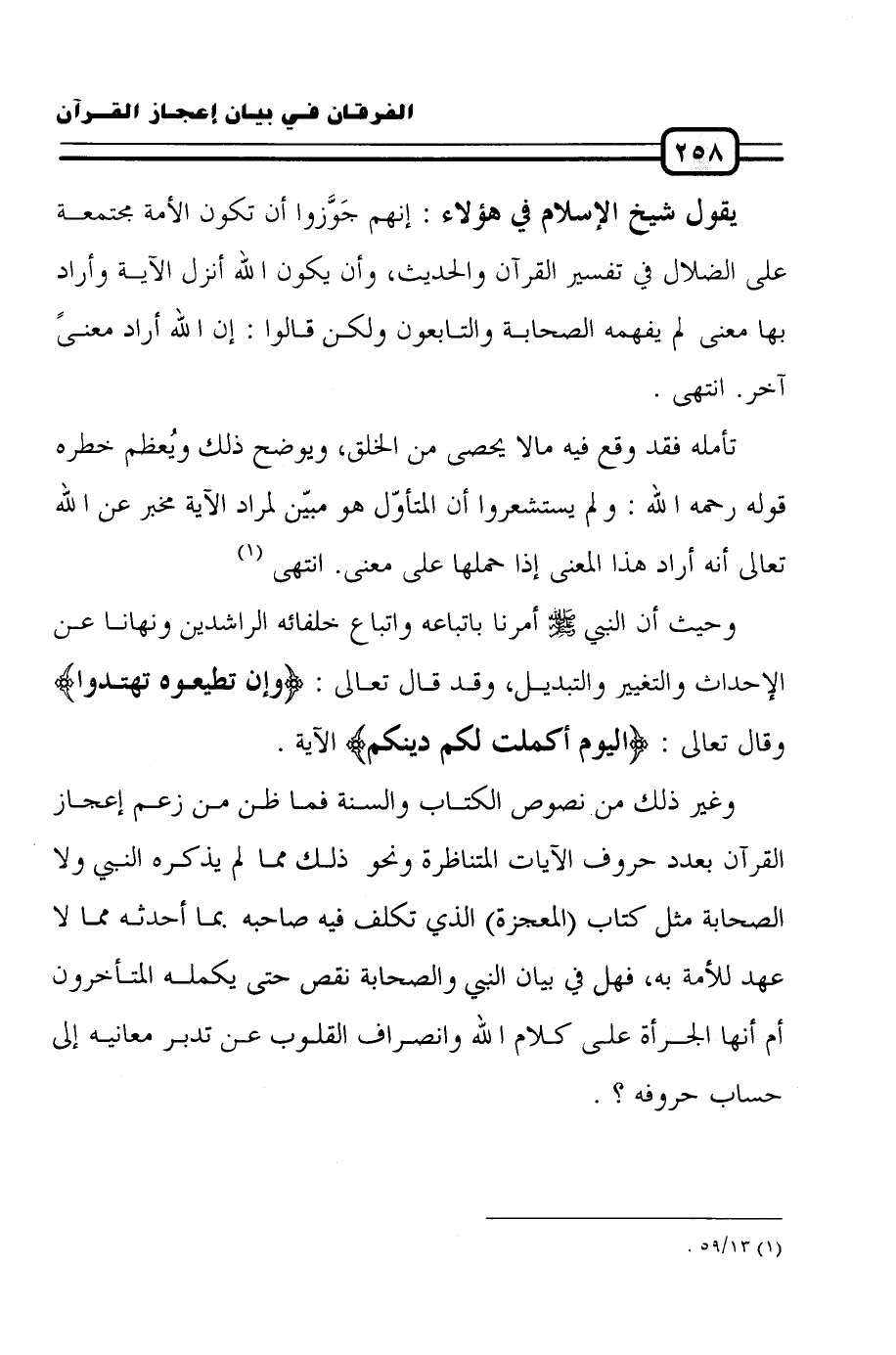 وغير ذلك من نصوص الكتاب والسنة فما ظن من زعم إعجاز القرآن بعدد حروف الآيات المتناظرة ونحو ذلك مما لم يذكره النبي ولا الصحابة مثل كتاب (المعجزة) الذي تكلف فيه صاحبه بما أحدثه مما لا يعهد للأمة به، فهل في بيان النبي والصحابة نقص حتى يكمله المتأخرون أم أنها الجرأة على كلام الله وانصراف القلوب عن تدبر معانيه إلى حساب حروفه؟.