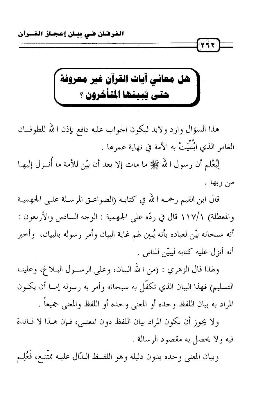 قال ابن القيم رحمه الله في كتابه (الصواعق المرسلة على الجهمية والمعطلة) 1/ 117 قال في ردّه على الجهمية: الوجه السادس والأربعون: أنه سبحانه بيّن بأنه يُبين لهم غاية البيان وأمر رسوله بالبيان، وأخبر أنه أنزل عليه كتابه ليبيّن للناس.
