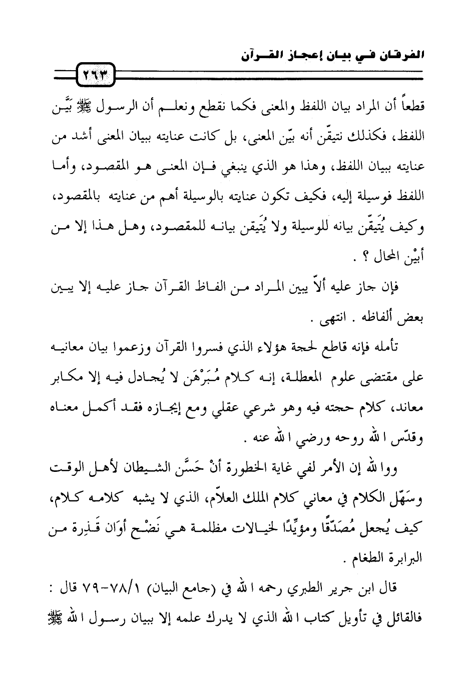تأمله فإنه قاطع لحجة هؤلاء الذي فسروا القرآن وزعموا بيان معانيه على مقتضى علوم المعطلة، إنه كلام مُبَرْهَن لا يُجادل فيه إلا مكابر معاند، كلام حجته فيه وهو شرعي عقلي ومع إيجازه فقد أكمل معناه، قدس الله روحه ورضي الله عنه.