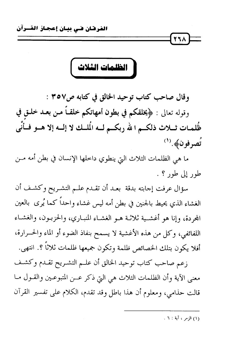 زعم صاحب كتاب توحيد الخالق أن علم التشريح تقدم وكشف معنى الآية وأن الظلمات الثلاث هي التي ذكر عن المتبوعين والقول ما قالت حذامي، ومعلوم أن هذا باطل وقد تقدم، الكلام على تفسير القرآن