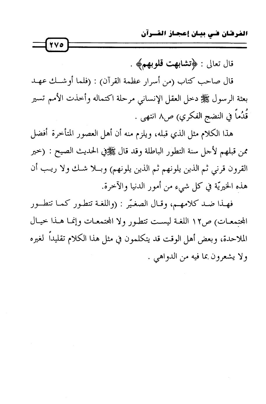 فهذا ضد كلامهم، وقال الصغيّر: (واللغة تتطور كما تتطور المجتمعات) ص12 اللغة ليست تتطور ولا المجتمعات وإنما هذا خيال الملاحدة، وبعض أهل الوقت قد يتكلمون في مثل هذا الكلام تقليداً لغيرهم ولا يشعرون بما فيه من الدواهي.