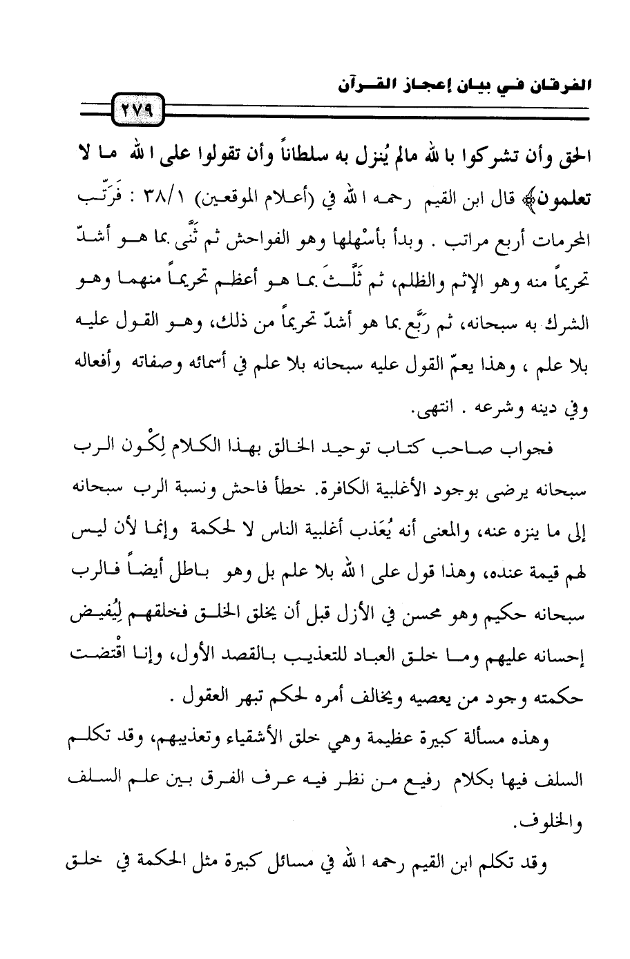 الْحَقِّ وَأَنْ تُشْرِكُوا بِاللَّهِ مَا لَمْ يُنَزِّلْ بِهِ سُلْطَاناً وَأَنْ تَقُولُوا عَلَى اللَّهِ مَا لا تَعْلَمُونَ) قال ابن القيم رحمه الله في (أعلام الموقعين) 1/ 38: فَرَتّب المحرمات أربع مراتب. وبدأ بأسْهلها وهو الفواحش ثم ثنَّى بما هو أشدّ تحريماً منه وهو الإثم والظلم، ثم ثلَّث بما هو أعظم تحريماً منهما وهو الشرك به سبحانه، ثم رَبَّع بما هو أشد تحريماً من ذلك، وهو القول عليه بلا علم، وهذا يعمّ القول عليه سبحانه بلا علم في أسمائه وصفاته وأفعاله وفي دينه وشرعه. انتهى.
