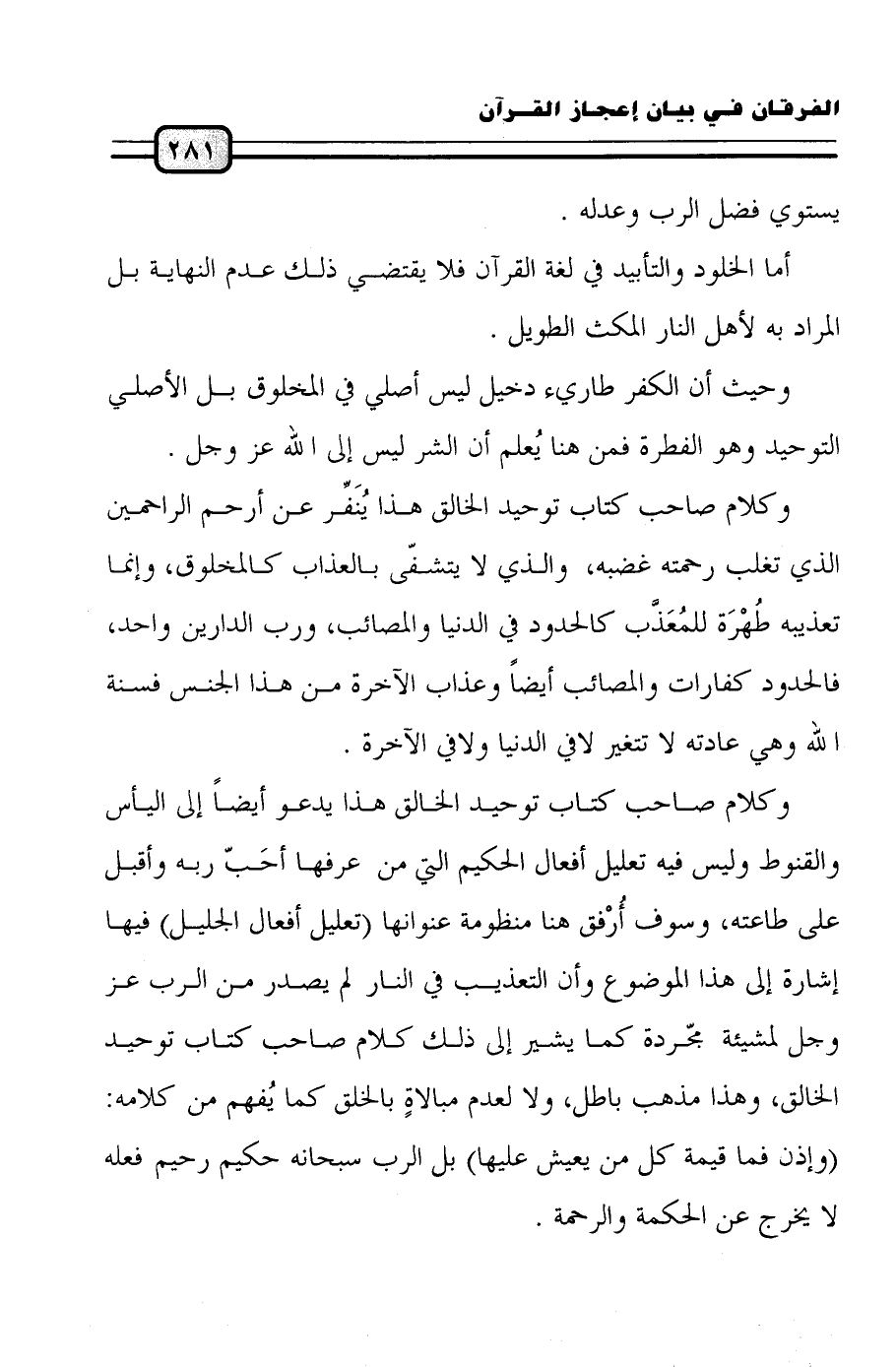 وكلام صاحب كتاب توحيد الخالق هذا يُنَفِّر عن أرحم الراحمين الذي تغلب رحمته غضبه، والذي لا يتشفّى بالعذاب كالمخلوق، وإنما تعذيبه طُهْرَة للمُعَذَّب كالحدود في الدنيا والمصائب، ورب الدارين واحد، فالحدود كفارات والمصائب أيضاً وعذاب الآخرة من هذا الجنس فسنة الله وهي عادته لا تتغير لا في الدنيا ولا في الآخرة.