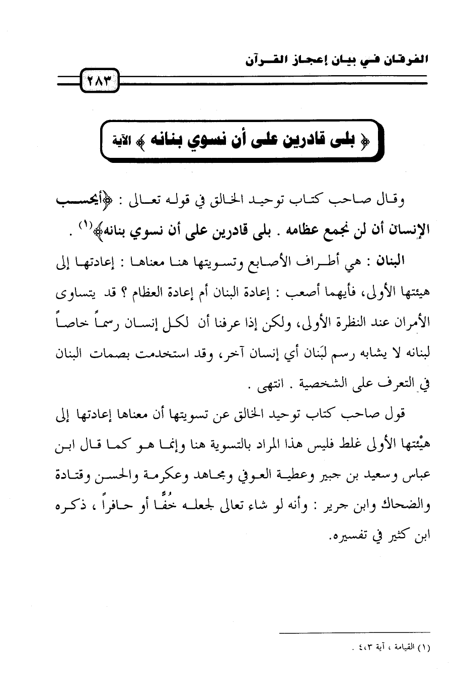 وقال صاحب كتاب توحيد الخالق في قوله تعالى: (أَيَحْسَبُ الإنْسَانُ أَلَّنْ نَجْمَعَ عِظَامَهُ * بَلَى قَادِرِينَ عَلَى أَنْ نُسَوِّيَ بَنَانَهُ) (¬1).