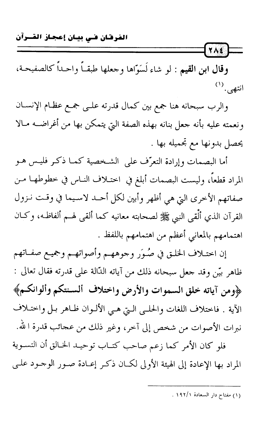أما البصمات وإرادة التعرّف على الشخصية كما ذكر فليس هو المراد قطعاً وليست البصمات أبلغ في اختلاف الناس في خطوطها من صفاتهم الأخرى التي هي أظهر وأبين لكل أحد لا سيما في وقت نزول القرآن الذي ألْقى النبي صلى الله عليه وسلم لصحابته معانيه كما ألقى لهم ألفاظه، وكان اهتمامهم بالمعاني أعظم من اهتمامهم باللفظ.