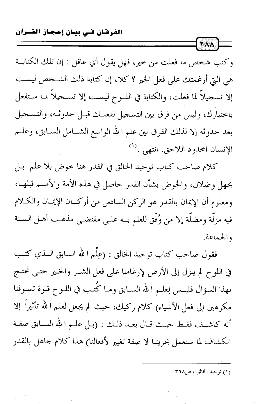 كلام صاحب كتاب توحيد الخالق في القدر هنا خوض بلا علم بل بجهل وضلال، والخوض بشأن القدر حاصل في هذه الأمة والأمم قبلها، ومعلوم أن الإيمان بالقدر هو الركن السادس من أركان الإيمان والكلام فيه مزلّة ومضلّة إلا من وُفّق للعلم به على مقتضى مذهب أهل السنة والجماعة.