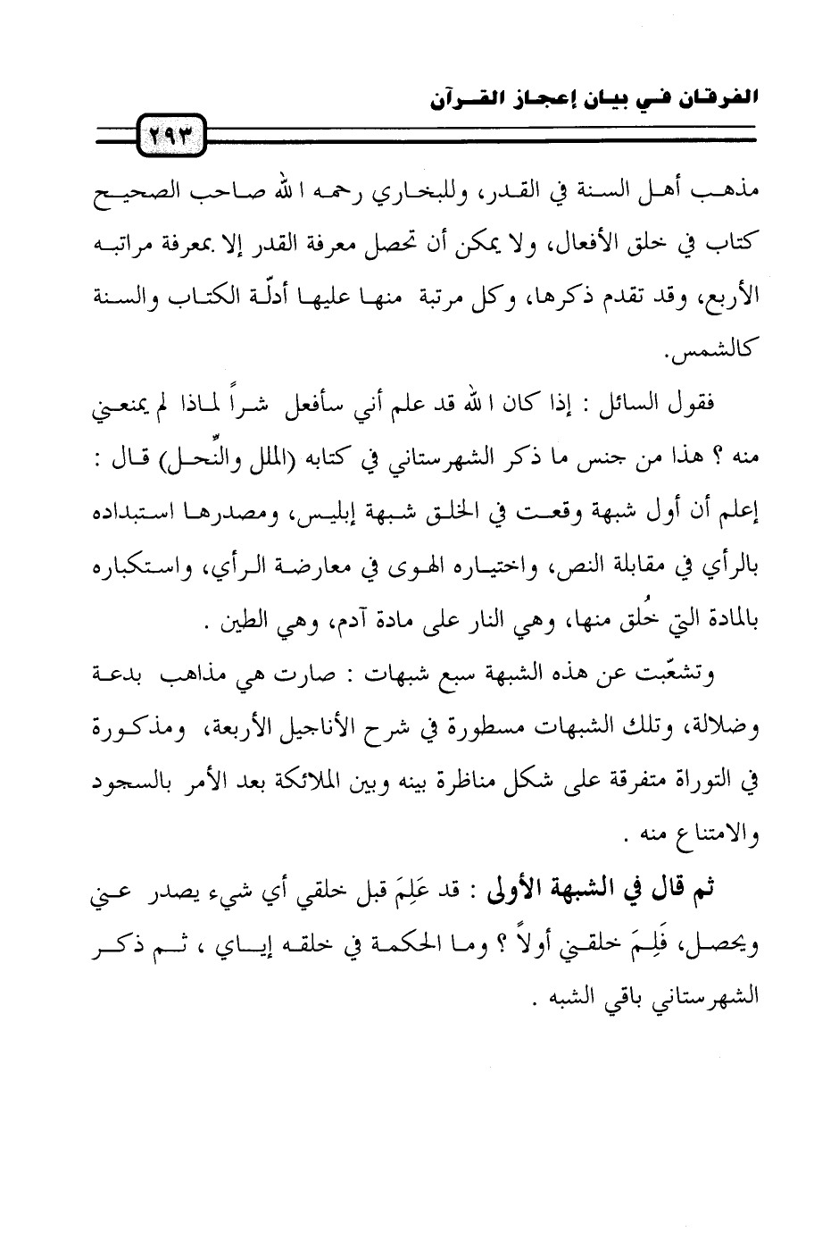 فقول السائل: إذا كان الله قد علم أني سأفعل شراً لماذا لم يمنعني منه؟ هذا من جنس ما ذكر الشهرستاني في كتابه (الملل والنِّحل) قال: إعلم أن أول شبهة وقعت في الخلق شبهة إبليس، ومصدرها استبداده بالرأي في مقابلة النص، واختياره الهوى في معارضة الرأي، واستكباره بالمادة التي خُلق منها، وهي النار على مادة آدم، وهي الطين.