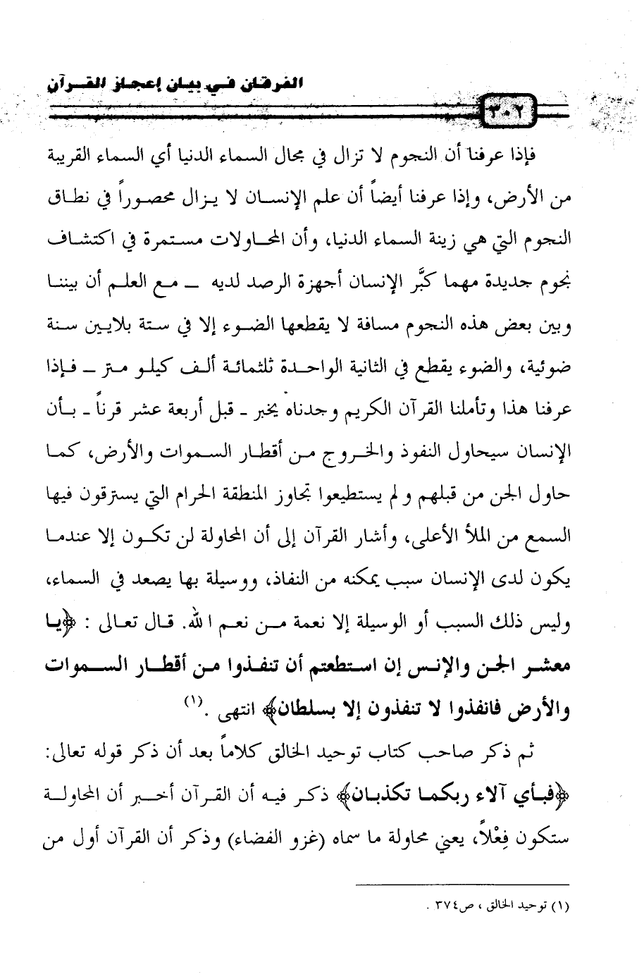 فإذا عرفنا أن النجوم لا تزال في مجال السماء الدنيا أي السماء القريبة من الأرض، وإذا عرفنا أيضاً أن علم الإنسان لا يزال محصوراً في نطاق النجوم التي هي زينة السماء الدنيا، وأن المحاولات مستمرة في اكتشاف نجوم جديدة مهما كبَّر الإنسان أجهزة الرصد لديه -مع العلم أن بيننا وبين بعض هذه النجوم مسافة لا يقطعها الضوء إلا في ستة بلايين سنة ضوئية، والضوء يقطع في الثانية الواحدة ثلثمائة ألف كيلو متر- فإذا عرفنا هذا وتأملنا القرآن الكريم وجدناه يخبر -قبل أربعة عشر قرناً- بأن الإنسان سيحاول النفوذ والخروج من أقطار السموات والأرض، كما حاول الجن من قبلهم ولم يستطيعوا تجاوز المنطقة الحرام التي يسترقون فيها السمع من الملأ الأعلى، وأشار القرآن إلى أن المحاولة لن تكون إلا عندما يكون لدى الإنسان سبب يمكنه من النفاذ ووسيلة بها يصعد في السماء وليس ذلك السبب أو الوسيلة إلا نعمة من نعم الله. قال تعالى: (يَا مَعْشَرَ الْجِنِّ وَالإِنْسِ إِنِ اسْتَطَعْتُمْ أَنْ تَنْفُذُوا مِنْ أَقْطَارِ السَّمَوَاتِ وَالأَرْضِ فَانْفُذُوا لا تَنْفُذُونَ إِلا بِسُلْطَانٍ) انتهى (¬1).