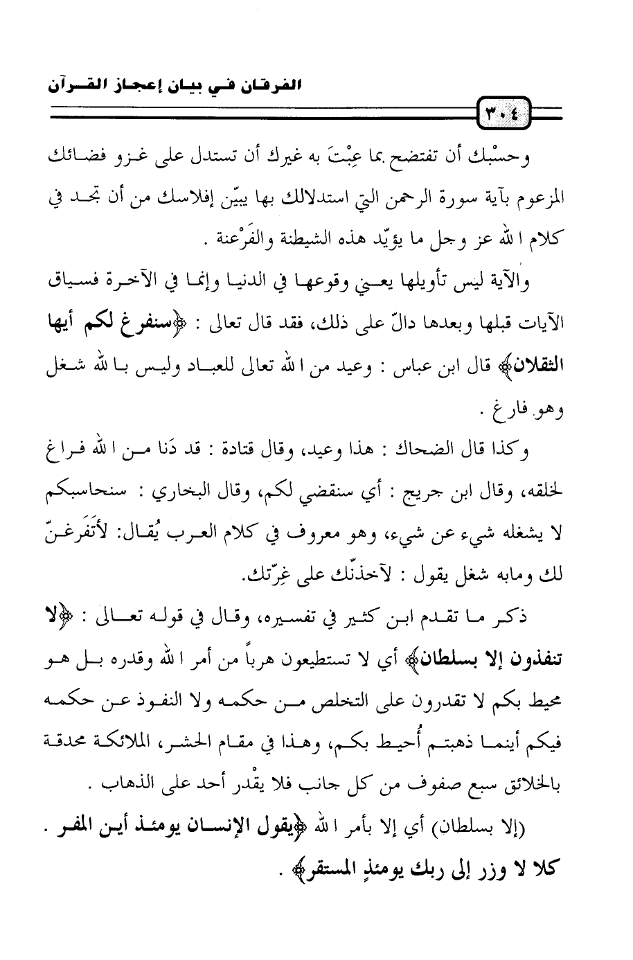 والآية ليس تأويلها يعني وقوعها في الدنيا وإنما في الآخرة فسياق الآيات قبلها وبعدها دالّ على ذلك، فقد قال تعالى: (سَنَفْرُغُ لَكُمْ أَيُّهَا الثَّقَلانِ) قال ابن عباس: وعيد من الله تعالى للعباد وليس بالله شغل وهو فارغ.