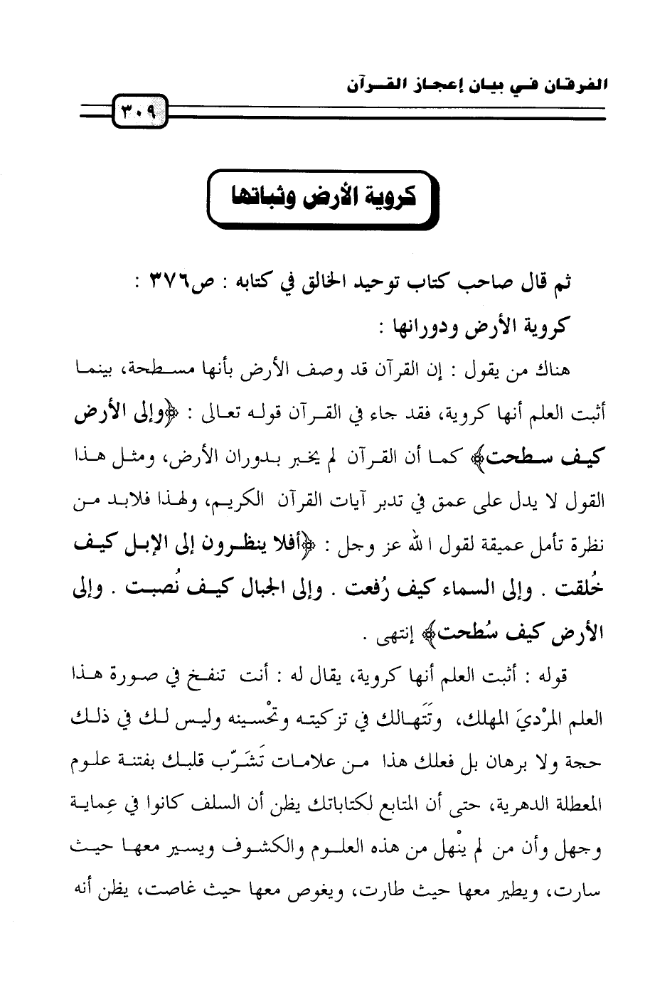 قوله: أثبت العلم أنها كروية، يقال له: أنت تنفخ في صورة هذا العلم المرْديَ المهلك، وتَتَهالك في تزكيته وتحْسينه وليس لك في ذلك حجة ولا برهان بل فعلك هذا من علامات تَشَرّب قلبك بفتنة علوم المعطلة الدهرية، حتى أن المتابع لكتاباتك يظن أن السلف كانوا في عِماية وجهل وأن من لم ينْهل من هذه العلوم والكشوف ويسير معها حيث سارت، ويطير معها حيث طارت، ويغوص معها حيث غاصت، يظن أنه