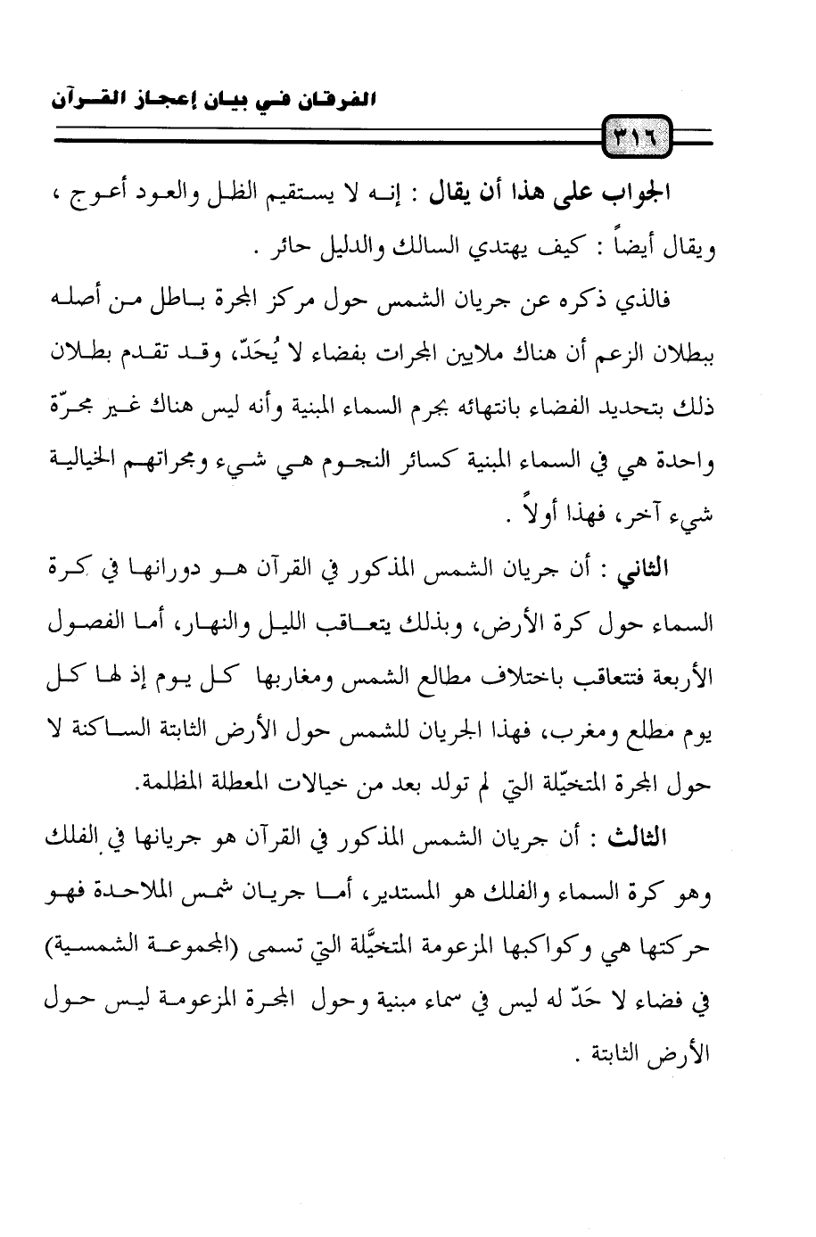 الثاني: أن جريان الشمس المذكور في القرآن هو دورانها في كرة السماء حول كرة الأرض، وبذلك يتعاقب الليل والنهار، أما الفصول الأربعة فتتعاقب باختلاف مطالع الشمس ومغاربها كل يوم إذ لها كل يوم مطلع ومغرب، فهذا الجريان للشمس حول الأرض الثابتة الساكنة لا حول المجرة المتخيّلة التي لم تولد بعد من خيالات المعطلة المظلمة.