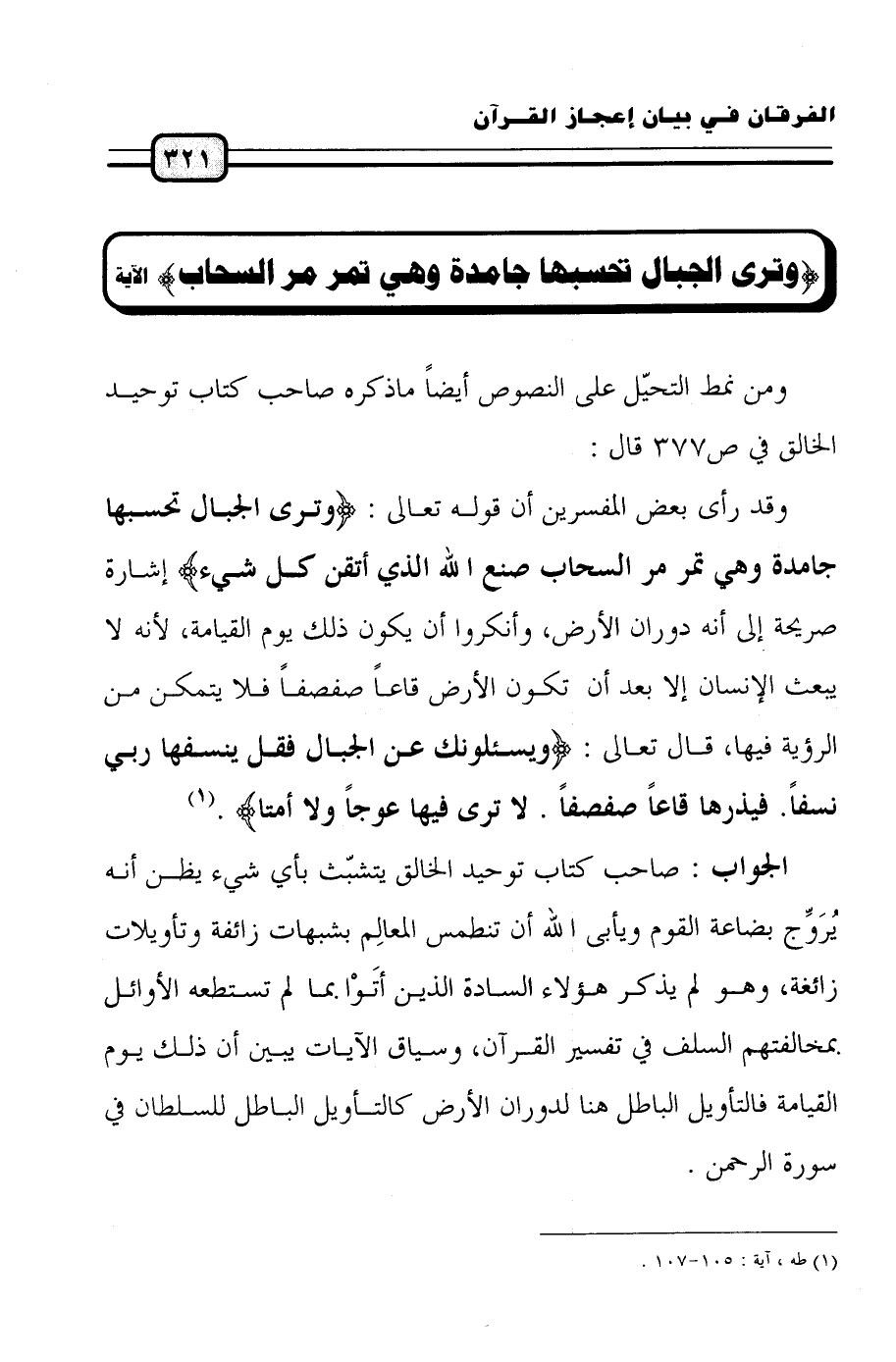 الجواب: صاحب كتاب توحيد الخالق يتشبّث بأي شيء يظن أنه يُرَوِّج بضاعة القوم ويأبى الله أن تنطمس المعالِم بشبهات زائفة وتأويلات زائغة وهو لم يذكر هؤلاء السادة الذين أتوا بما لم تستطعه الأوائل بمخالفتهم السلف في تفسير القرآن، وسياق الآيات يبين أن ذلك يوم القيامة فالتأويل الباطل هنا لدوران الأرض كالتأويل الباطل للسلطان في سورة الرحمن.