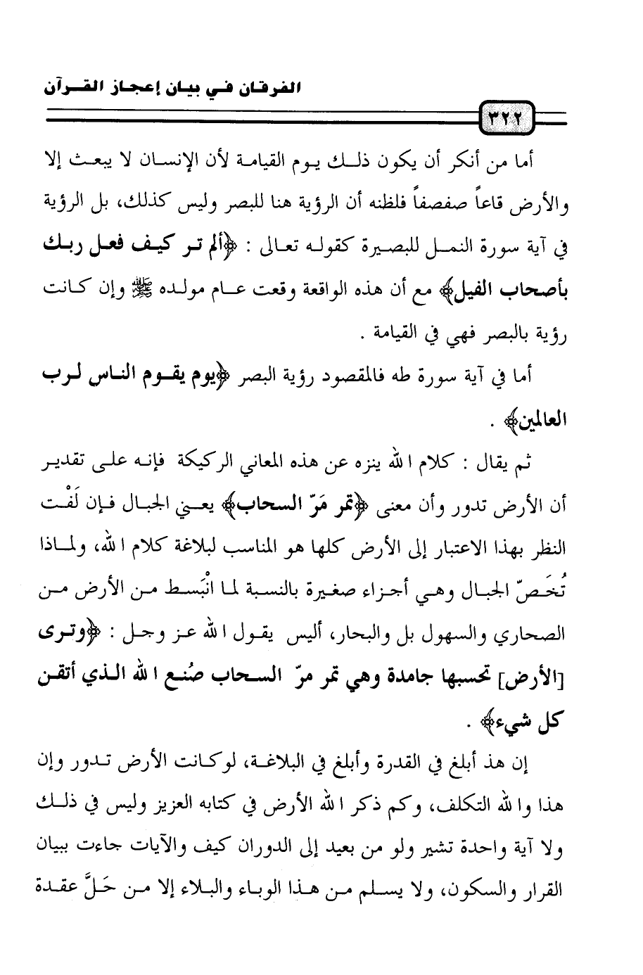 أما من أنكر أن يكون ذلك يوم القيامة لأن الإنسان لا يبعث إلا والأرض قاعاً صفصفاً فلظنه أن الرؤية هنا للبصر وليس كذلك، بل الرؤية في آية سورة النمل للبصيرة كقوله تعالى: (أَلَمْ تَرَ كَيْفَ فَعَلَ رَبُّكَ بِأَصْحَابِ الْفِيلِ) مع أن هذه الواقعة وقعت عام مولده صلى الله عليه وسلم وإن كانت رؤية بالبصر فهي في القيامة.