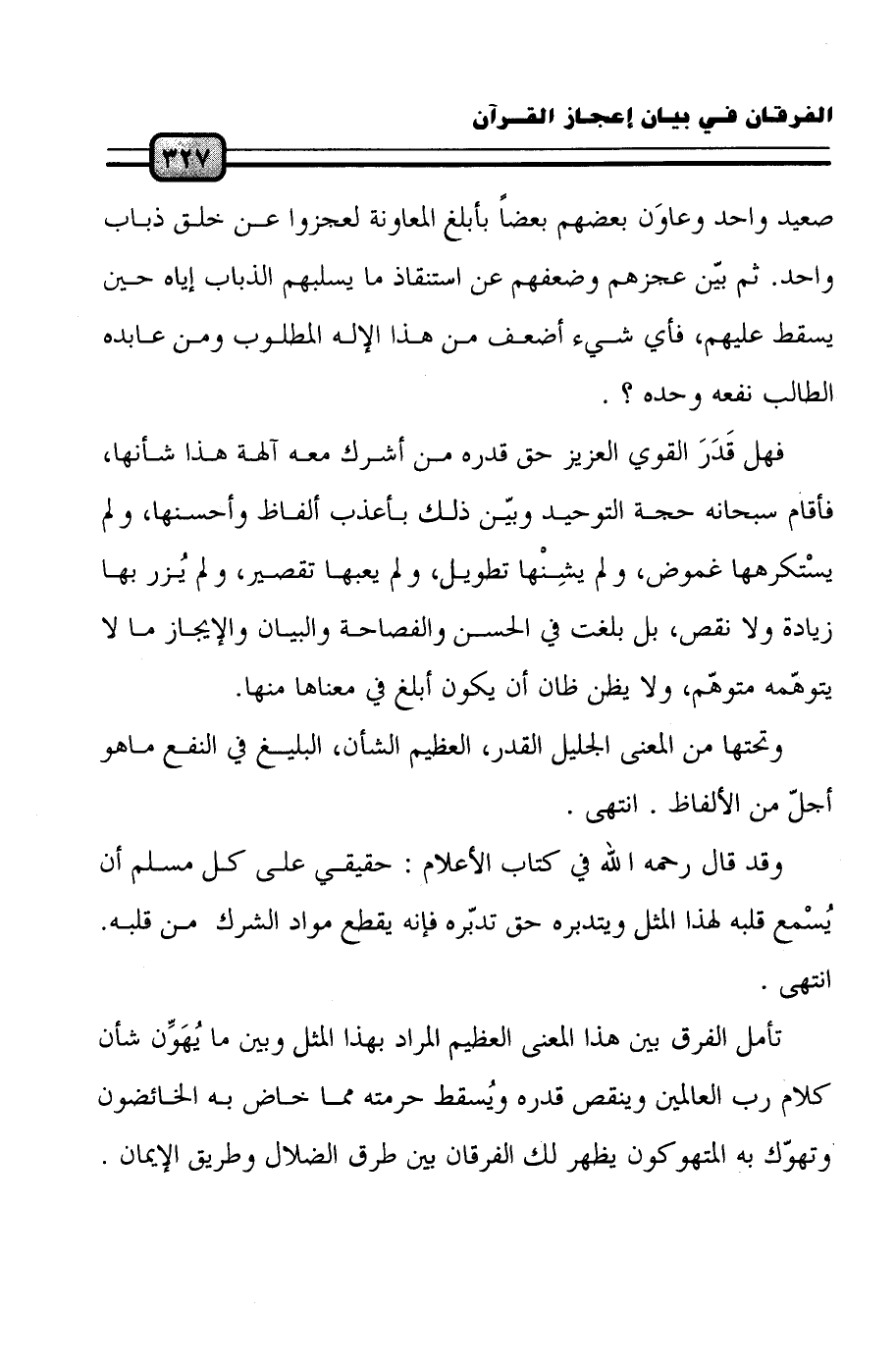 فهل قَدَرَ القوي العزيز حق قدره من أشرك معه آلهة هذا شأنها، فأقام سبحانه حجة التوحيد وبيّن ذلك بأعذب ألفاظ وأحسنها، ولم يستكرهها غموض، ولم يشِنْها تطويل، ولم يعبها تقصير، ولم يُزر بها زيادة ولا نقص، بل بلغت في الحسن والفصاحة والبيان والإيجاز ما لا يتوهمه متوهّم، ولا يظن ظان أن يكون أبلغ من معناها منها.