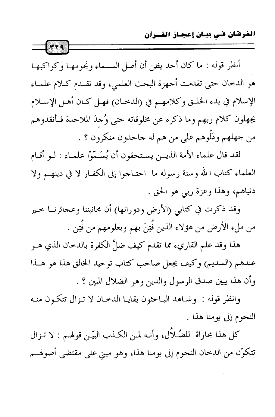 هذا وقد علم القارئ مما تقدم كيف ضلَّ الكفرة بالدخان الذي هو عندهم (السديم) وكيف يجعل صاحب كتاب توحيد الخالق هذا هو هذا وأن هذا يبين صدق الرسول والدين وهو الضلال المبين؟.