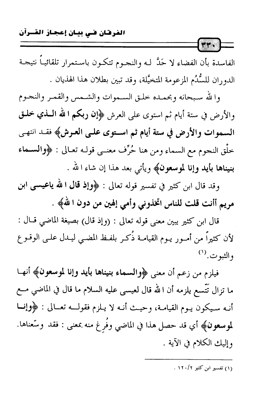 فيلزم من زعم أن معنى (وَالسَّمَاءَ بَنَيْنَاهَا بِأَيْدٍ وَإِنَّا لَمُوسِعُونَ) أنها ما تزال تَتّسع يلزمه أن الله قال لعيسى عليه السلام ما قال في الماضي مع أنه سيكون يوم القيامة، وحيث أنه لا يلزم فقوله تعالى: (وَإِنَّا لَمُوسِعُونَ) أي قد حصل هذا في الماضي وفُرِغ منه بمعنى: فقد وسْعناها. وإليك الكلام في الآية.