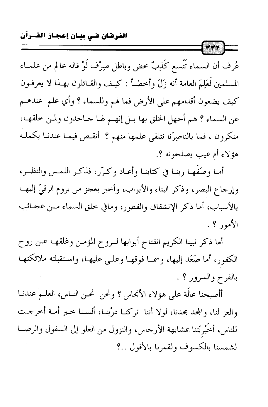 أما وصَفَها ربنا في كتابنا وأعاد وكرّر، فذكر اللمس والنظر، وإرجاع البصر، وذكر البناء والأبواب، وأخبر بعجز من يروم الرقيّ إليها بالأسباب، أما ذكر الانشقاق والفطور، وما في خلق السماء من عجائب الأمور؟.