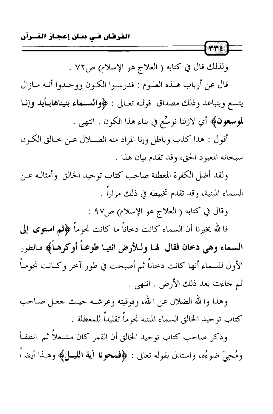 قال عن أرباب هذه العلوم: فدرسوا الكون ووجدوا أنه ما زال يتسع ويتباعد وذلك مصداق قوله تعالى: (وَالسَّمَاءَ بَنَيْنَاهَا بِأَيْدٍ وَإِنَّا لَمُوسِعُونَ) أي لا زلنا نوسِّع في بناء هذا الكون. انتهى.
