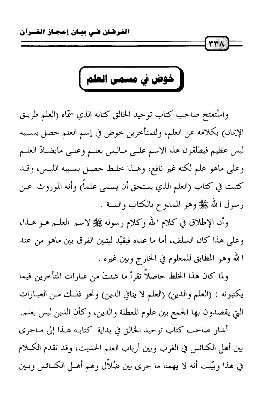 واسْتفتح صاحب كتاب توحيد الخالق كتابه الذي سمّاه (العلم طريق الإيمان) بكلامه عن العلم، وللمتأخرين خوض في اسم العلم حصل بسببه لبس عظيم فيطلقون هذا الاسم على ما ليس بعلم وعلى ما يضاد العلم وعلى ما هو علم لكنه غير نافع، وهذا خلط حصل بسببه اللبس، وقد كتبت في كتاب (العلم الذي يستحق أن يسمى علماً) وأنه الموروث عن رسول الله صلى الله عليه وسلم وهو الممدوح بالكتاب والسنة.