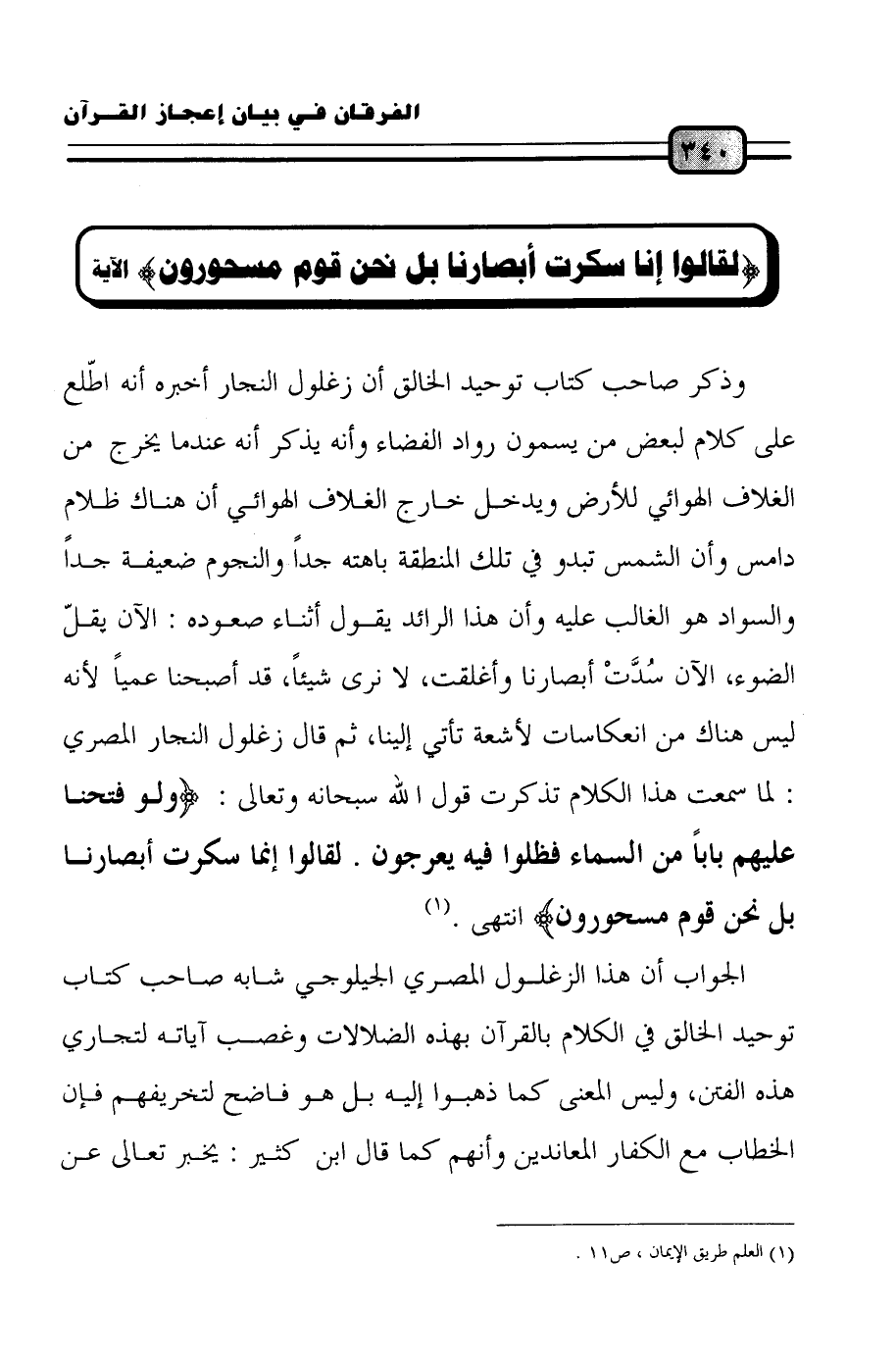 الجواب: أن هذا الزغلول المصري الجيولوجي شابه صاحب كتاب توحيد الخالق في الكلام بالقرآن بهذه الضلالات وغصب آياته لتجاري هذه الفتن، وليس المعنى كما ذهبوا إليه بل هو فاضح لتخريفهم فإن الخطاب مع الكفار المعاندين وأنهم كما قال ابن كثير: يخبر تعالى عن