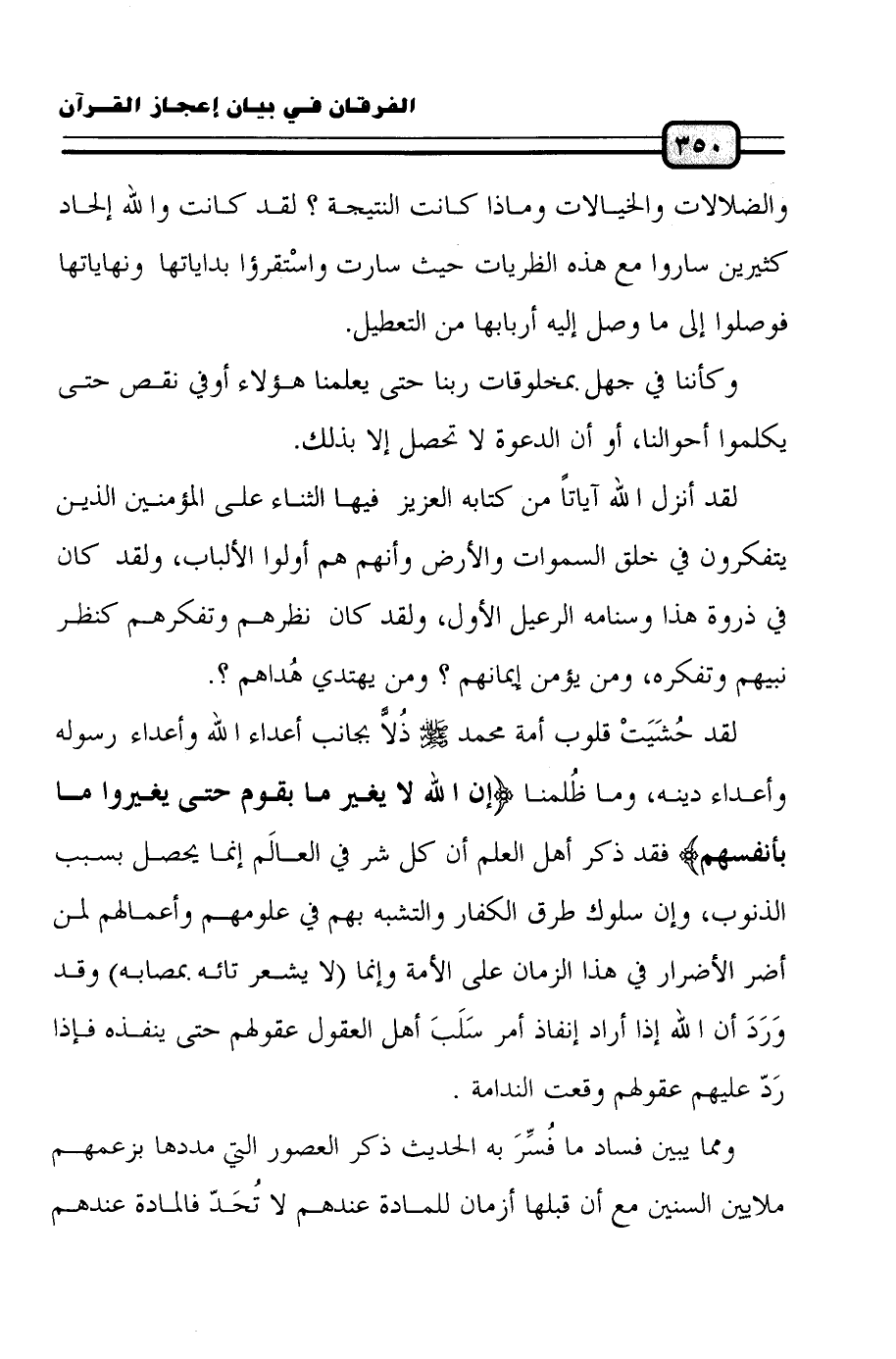 لقد حُشيَتْ قلوب أمة محمد صلى الله عليه وسلم ذُلاًّ بجانب أعداء الله وأعداء رسوله وأعداء دينه، وما ظُلمنا (إِنَّ اللَّهَ لا يُغَيِّرُ مَا بِقَوْمٍ حَتَّى يُغَيِّرُوا مَا بِأَنْفُسِهِمْ) فقد ذكر أهل العلم أن كل شر في العالَم إنما يحصل بسبب الذنوب، وأن سلوك طرق الكفار والتشبه بهم في علومهم وأعمالهم لمن أضر الأضرار في هذا الزمان على الأمة وإنما (لا يشعر تائه لمصابه) وقد وَرَدَ أن الله إذا أراد إنفاذ أمر سَلَبَ أهل العقول عقولهم حتى ينفذه فإذا رَدّ عليهم عقولهم وقعت الندامة.