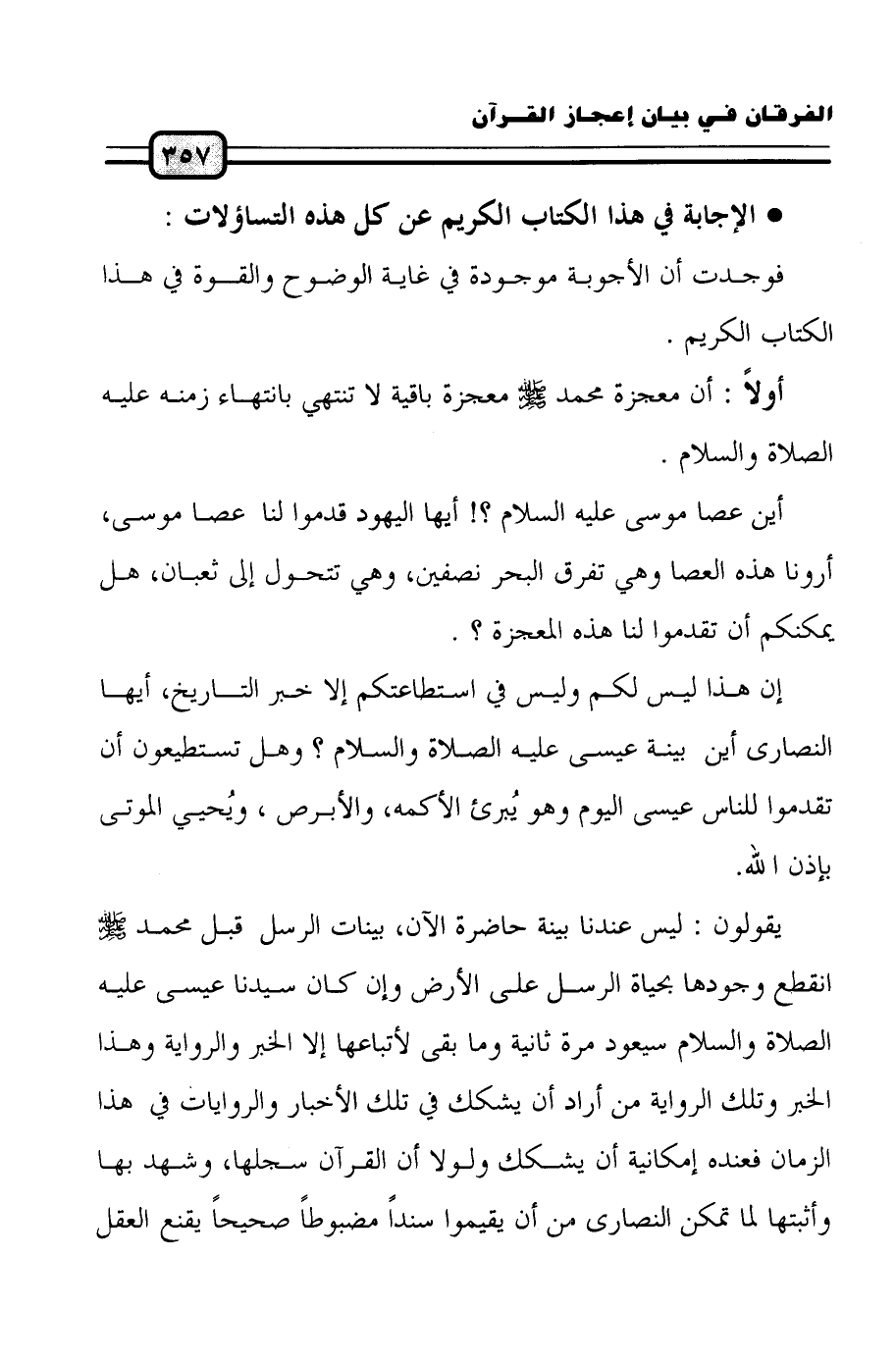 أولاً: أن معجزة محمد صلى الله عليه وسلم باقية لا تنتهي بانتهاء زمنه عليه الصلاة والسلام.