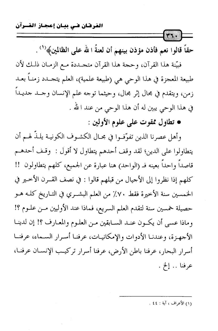 وأهل عصرنا الذين تفوّقوا في مجال الكشوف الكونية يلذّ لهم أن يتطاولوا على الدين؛ لقد وقف احدهم يتطاول لا أقول: وقف أحدهم قاصداً واحداً بعينه فـ (الواحد) هنا عبارة عن الجميع، كلهم يتطاولون!! كلهم إذا نظروا إلى الأجيال من قبلهم قالوا: في نصف القرن الأخير في الخمسين سنة الأخيرة فقط 70% من العلم البشري في التاريخ كله هو حصيلة خمسين سنة لتقدم العلم السريع، فماذا عند الأولين من علوم؟! وماذا عسى أن يكون عند السابقين من العلوم والمعارف؟! إن لدينا الأجهزة، وعندنا الأدوات والإمكانيات، عرفنا أسرار السماء، عرفنا أسرار البحار، عرفنا باطن الأرض، عرفنا أسرار تركيب الإنسان، عرفنا، عرفنا ... إلخ.