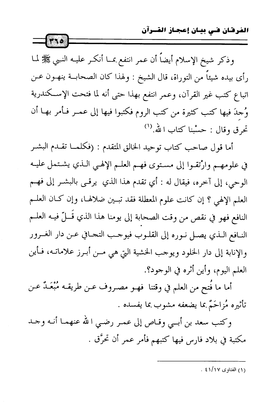 وذكر شيخ الإسلام أيضاً أن عمر انتفع بما أنكر عليه النبي صلى الله عليه وسلم لما رأى بيده شيئاً من التوراة (¬1)، قال الشيخ: ولهذا كان الصحابة ينهون عن اتباع كتب غير القرآن، وعمر انتفع بهذا حتى أنه لما فتحت الإسكندرية وُجِدَ فيها كتب كثيرة من كتب الروم فكتبوا فيها إلى عمر فأمر بها أن تحرق وقال: حسْبنا كتاب الله (¬2).