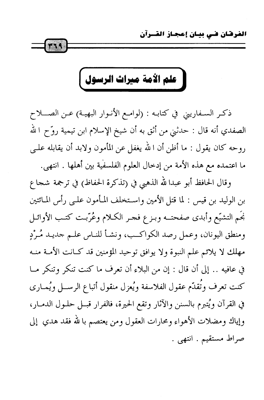 وقال الحافظ أبو عبد الله الذهبي في (تذكرة الحفاظ) في ترجمة شجاع ابن الوليد بن قيس: لما قتل الأمين واستخلف المأمون على رأس المائتين نَجم التشيّع وأبدى صفحته وبزغ فجر الكلام وعُرّبت كتب الأوائل ومنطق اليونان، وعمل رصد الكواكب، ونشأ للناس علم جديد مُرْدٍ مهلك لا يلائم علم النبوة ولا يوافق توحيد المؤمنين قد كانت الأمة منه في عافية ... إلى أن قال: إن من البلاء أن تعرف ما كانت تنكر وتنكر ما كنت تعرف وتُقدّم عقول الفلاسفة ويُعزل منقول أتباع الرسل ويُمارى في القرآن ويُتبرم بالسنن والآثار وتقع الحيرة، فالفرار قبل حلول الدمار، وإياك ومضلات الأهواء ومحارات العقول ومن يعتصم بالله فقد هدي إلى صراط مستقيم. انتهى.