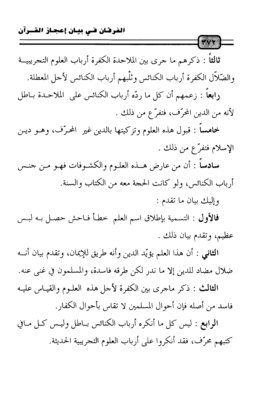 سادساً: أن من عارض هذه العلوم والكشوفات فهو من جنس أرباب الكنائس، ولو كانت الحجة معه من الكتاب والسنة.