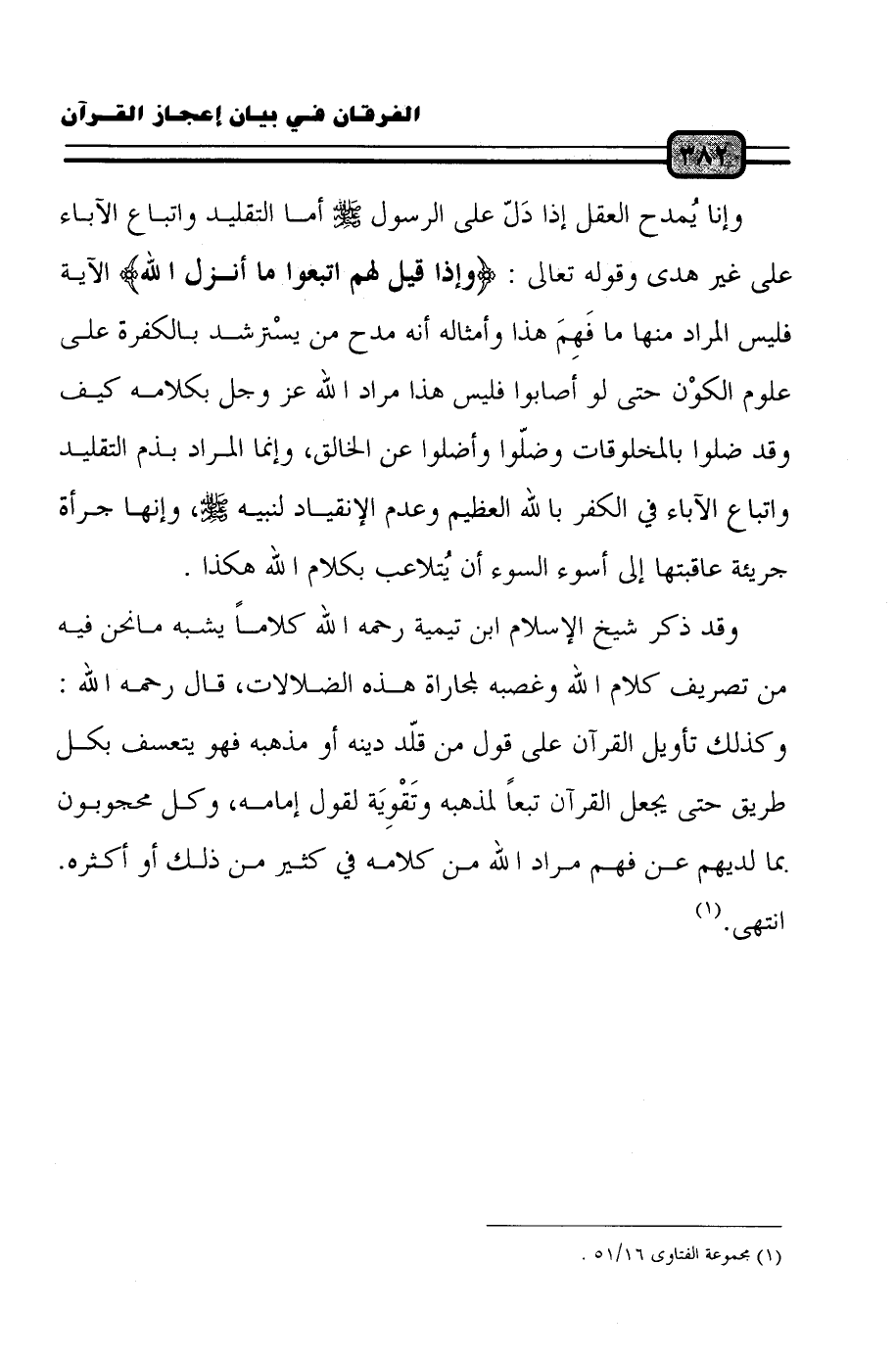 وقد ذكر شيخ الإسلام ابن تيمية رحمه الله كلاماً يشبه ما نحن فيه من تصريف كلام الله وغصبه لمجاراة هذه الضلالات، قال رحمه الله: وكذلك تأويل القرآن على قول من قلّد دينه أو مذهبه فهو يتعسف بكل طريق حتى يجعل القرآن تبعاً لمذهبه وتَقْوِيَة لقول إمامه، وكل محجوبون بما لديهم عن فهم مراد الله من كلامه في كثير من ذلك أو أكثره. انتهى (¬1).