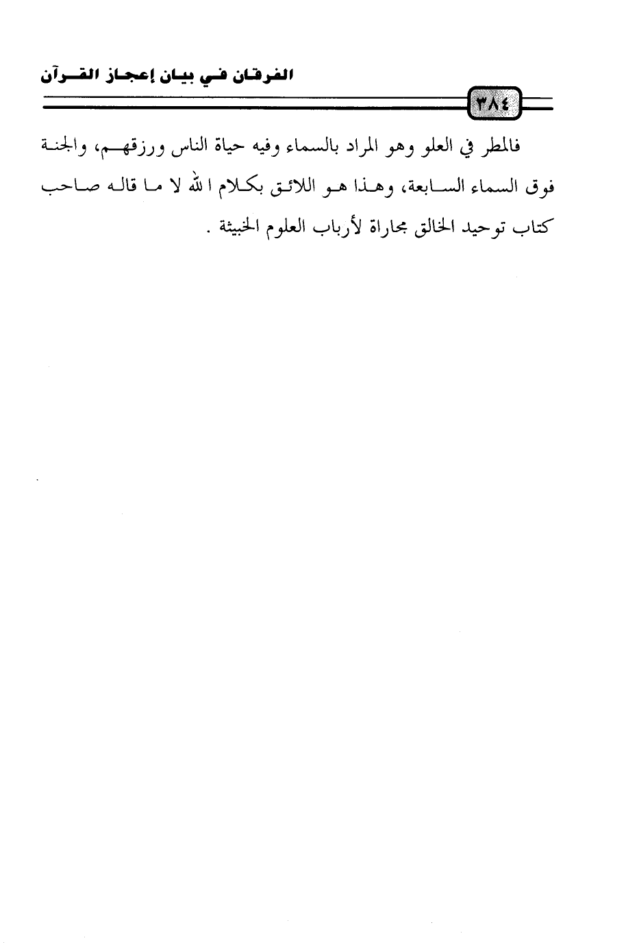 فالمطر في العلو وهو المراد بالسماء وفيه حياة الناس ورزقهم، والجنة فوق السماء السابعة، وهذا هو اللائق بكلام الله لا ما قاله صاحب كتاب توحيد الخالق مجاراة لأرباب العلوم الخبيثة.