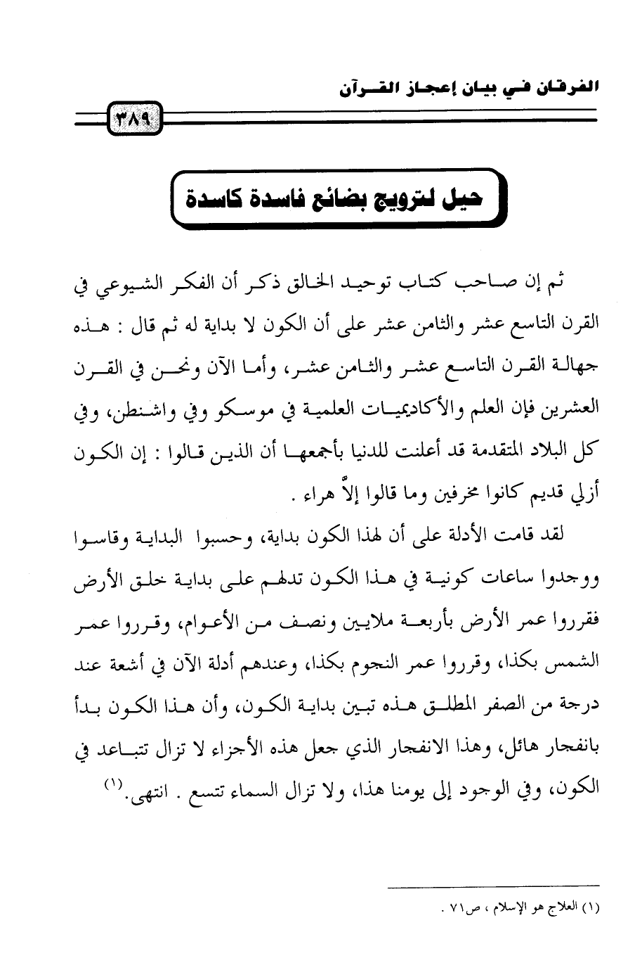 ثم إن صاحب كتاب توحيد الخالق ذكر أن الفكر الشيوعي في القرن التاسع عشر والثامن عشر على أن الكون لا بداية له ثم قال: هذه جهالة القرن التاسع عشر والثامن عشر، وأما الآن ونحن في القرن العشرين فإن العلم والأكاديميات العلمية في موسكو وفي واشنطن، وفي كل البلاد المتقدمة قد أعلنت للدنيا بأجمعها أن الذين قالوا: إن الكون أزلي قديم كانوا مخرفين وما قالوا إلاَّ هراء.