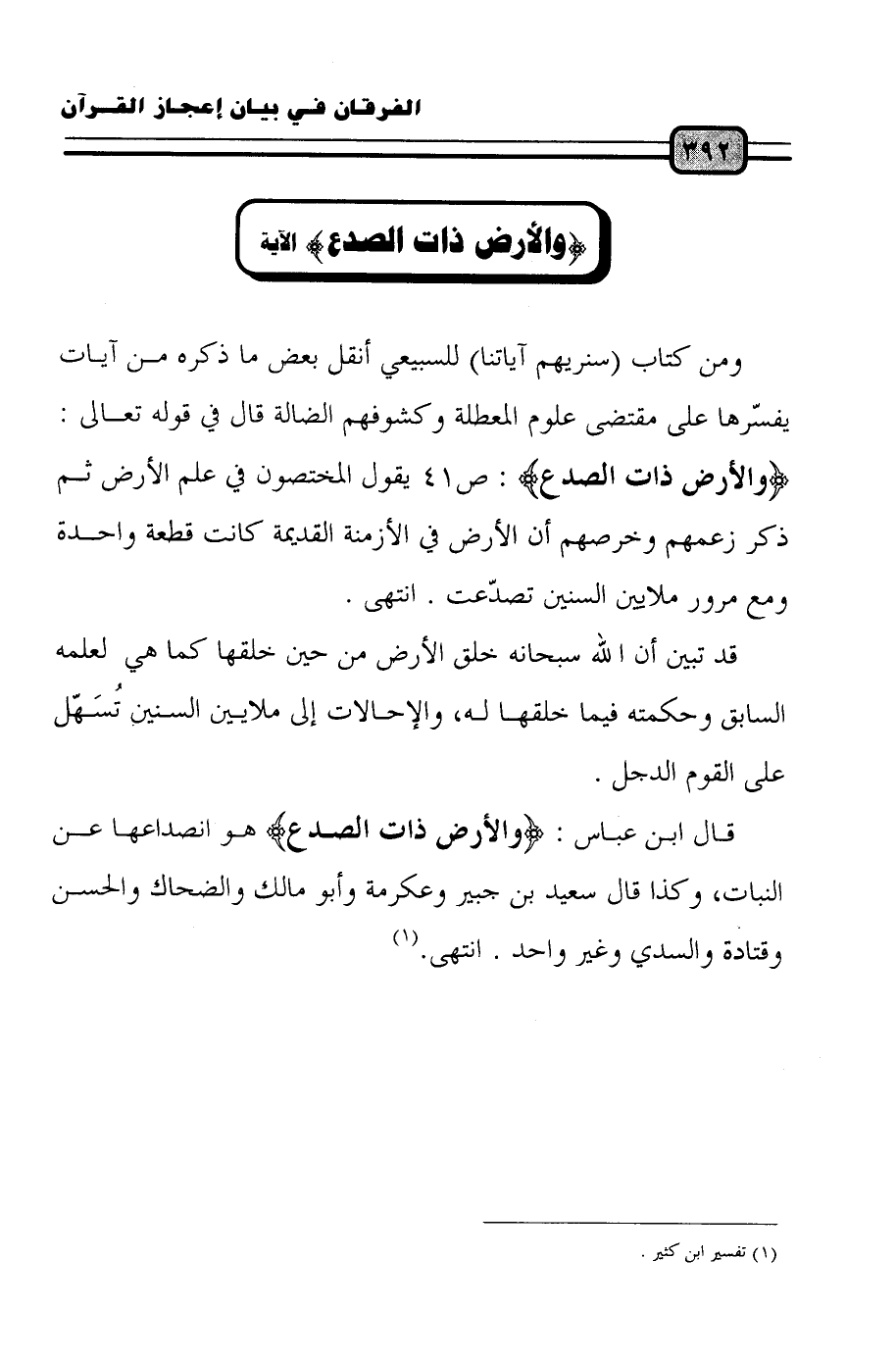 ومن كتاب (سنريهم آياتنا) للسبيعي أنقل بعض ما ذكره من آيات يفسّرها على مقتضى علوم المعطلة وكشوفهم الضالة قال في قوله تعالى: (وَالأَرْضِ ذَاتِ الصَّدْعِ): (ص41) يقول المختصون في علم الأرض ثم ذكر زعمهم وخرصهم أن الأرض في الأزمنة القديمة كانت قطعة واحدة ومع مرور ملايين السنين تصدّعت. انتهى.