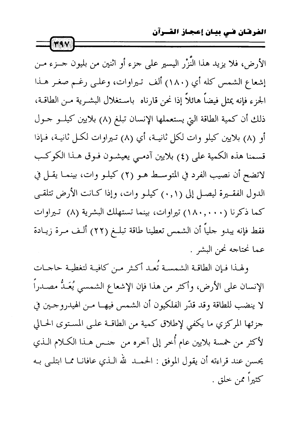 ولهذا فإن الطاقة الشمسية تُعد أكثر من كافية لتغطية حاجات الإنسان على الأرض، وأكثر من هذا فإن الإشعاع الشمسي يُعَدُّ مصدراً لا ينضب للطاقة وقد قدّر الفلكيون أن الشمس فيها من الهيدروجين في جزئها المركزي ما يكفي لإطلاق كمية من الطاقة على المستوى الحالي لأكثر من خمسة بلايين عام أُخر إلى آخره من جنس هذا الكلام الذي يحسن عند قراءته أن يقول الموفق: الحمد لله الذي عافانا مما ابتلى به كثيراً ممن خلق.