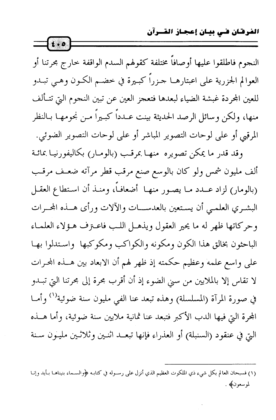وقد قدر ما يمكن تصويره منها بمرقب (بالومار) بكاليفورنيا بمائة ألف مليون شمس ولو كان بالوسع صنع مرقب قطر مرآته ضعف مرقب (بالومار) لزاد عدد ما يصور منها أضعافاً، ومنذ أن استطاع العقل البشري العلمي أن يستعين بالعدسات والآلات ورأى هذه المجرات وحركاتها ظهر له مل يحير العقول ويذهل اللب فاعترف هؤلاء العلماء الباحثون بخالق هذا الكون ومكونه والكواكب ومكوكبها واستدلوا بها على واسع علمه وعظيم حكمته إذ ظهر لهم أن الأبعاد بين هذه المجرات لا تقاس إلا بالملايين من سني الضوء إذ أن اقرب مجرة إلى مجرتنا التي تبدو في صورة المرآة (المسلسلة) وهذه تبعد عنا ألفي مليون سنة ضوئية (¬1) وأما المجرة التي فيها الدب الأكبر فتبعد عنا ثمانية ملايين سنة ضوئية، وأما هذه التي في عنقود (السنبلة) أو العذراء فإنها تبعد اثنين وثلاثين مليون سنة