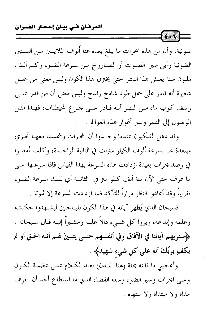 ضوئية، وأن من هذه المجرات ما يبلغ بعده عنا أُلوف الملايين من السنين الضوئية، وأين سير الصوت أو الصاروخ من سرعة الضوء وكم ألف مليون سنة يعيش هذا البشر حتى يخترق هذا الكون وليس معنى من حمل شعيرة أنه قادر على حمل طود شامخ راسخ وليس معنى أن من قدر على رشف كوب ماء من النهر أنه قادر على جرع المحيطات، فهذا مثل الوصول إلى القمر وسبر أغوار هذه العوالم.