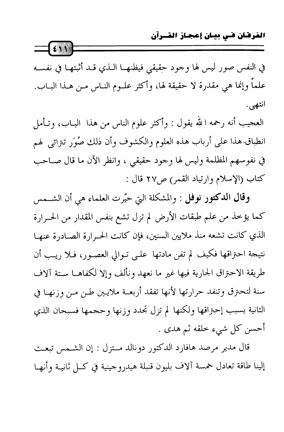 وقال الدكتور نوفل: والمشكلة التي حيّرت العلماء هي أن الشمس كما يؤخذ من علم طبقات الأرض لم تزل تشع بنفس المقدار من الحرارة الذي كانت تشعه منذ ملايين السنين، فإن كانت الحرارة الصادرة عنها نتيجة احتراقها فكيف لم تفن مادتها على توالي العصور، فلا ريب أن طريقة الاحتراق الجارية فيها غير ما نعهد ونألف وإلا لكفاها ستة آلاف سنة لتحترق وتنفد حرارتها لأنها تفقد أربعة ملايين طن من وزنها في الثانية بسبب إحتراقها ولكنها لم تزل تجدد وزنها وحجمها فسبحان الذي أحسن كل شيء خلقه ثم هدى.