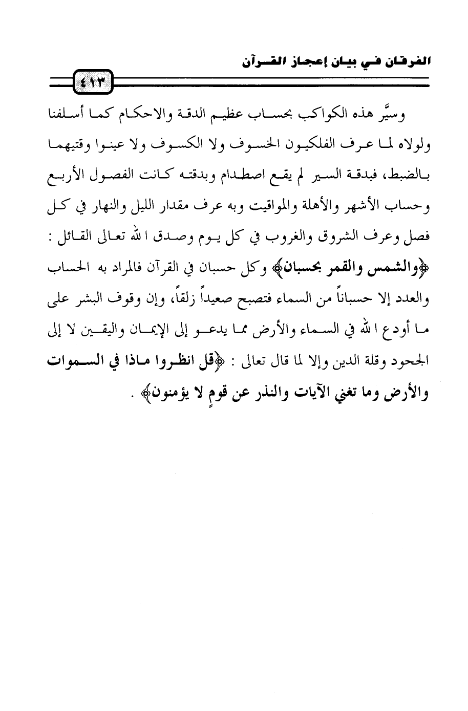 وسيَّر هذه الكواكب بحساب عظيم الدقة والأحكام كما أسلفنا ولولاه لما عرف الفلكيون الخسوف ولا الكسوف ولا عينوا وقتيهما بالضبط، فبدقة السير لم يقع اصطدام وبدقته كانت الفصول الأربع وحساب الأشهر والأهلة والمواقيت وبه عرف مقدار الليل والنهار في كل فصل وعرف الشروق والغروب في كل يوم وصدق الله تعالى القائل: (والشَّمْسُ وَالْقَمَرُ بِحُسْبَانٍ) وكل حسبان في القرآن فالمراد به الحساب والعدد إلا حسباناً من السماء فتصبح صعيداً زلقاً، وإن وقوف البشر على ما أودع الله في السماء والأرض مما يدعو إلى الإيمان واليقين لا إلى الجحود وقلة الدين وإلا لما قال تعالى: (قُلِ انظُرُواْ مَاذَا فِي السَّمَوَاتِ وَالأَرْضِ وَمَا تُغْنِي الآيَاتُ وَالنُّذُرُ عَن قَوْمٍ لاَّ يُؤْمِنُونَ).