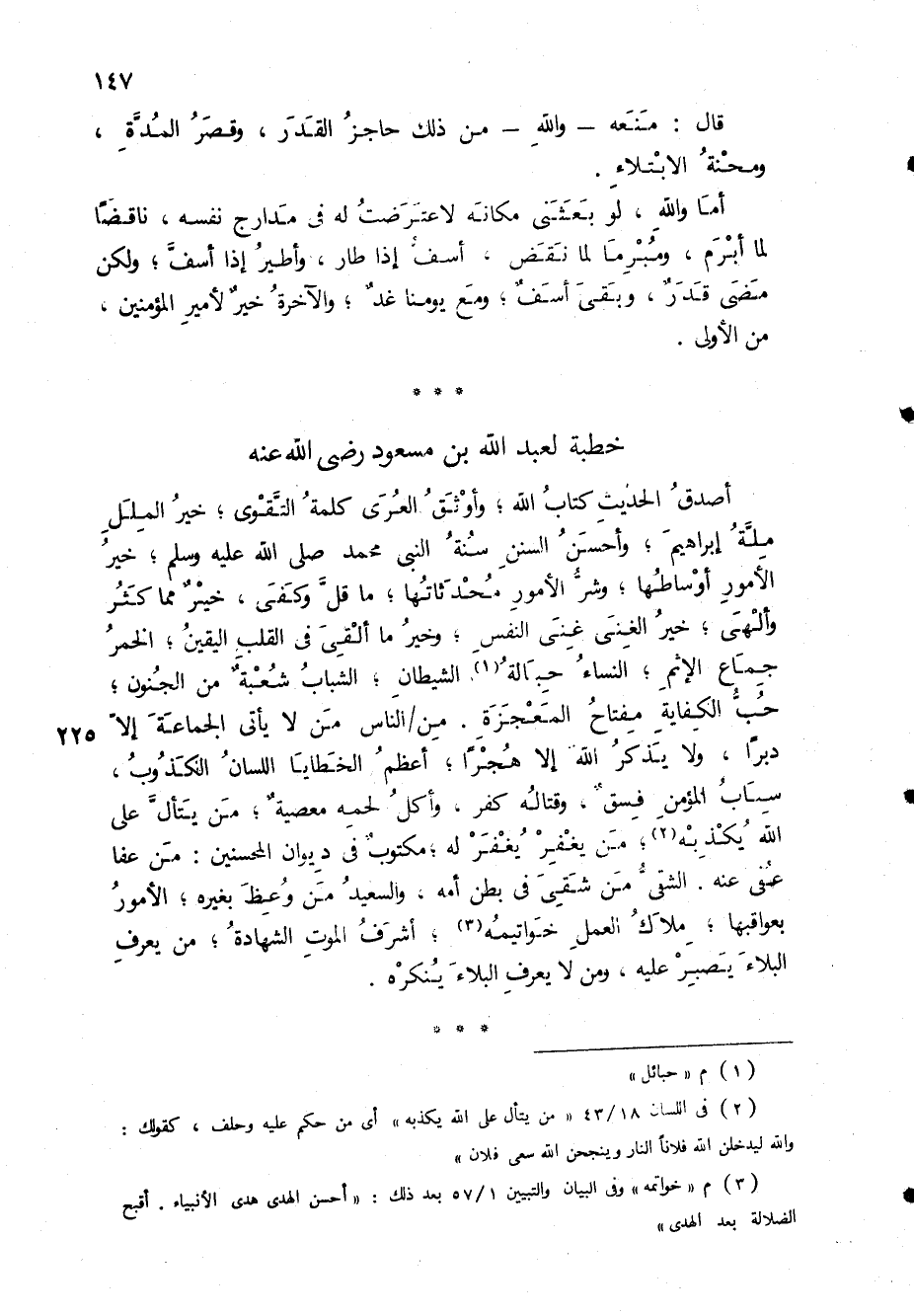 * * * خطبة لعبد الله بن مسعود رضي الله عنه أصدق الحديث كتاب الله، وأوثق العرى كلمة التقوى، خير الملل ملة إبراهيم، وأحسن السنن سنة النبي محمد صلى الله عليه وسلم، خير الأمور أوساطها، وشر الأمور محدثاتها، ما قلّ وكفى، خير مما كثر وألهى، خير الغنى غنى النفس، وخير ما ألقي في القلب اليقين، الخمر جماع الاثم، النساء حبالة (1) الشيطان، الشباب شعبة من الجنون، حب الكفاية مفتاح المعجزة.
