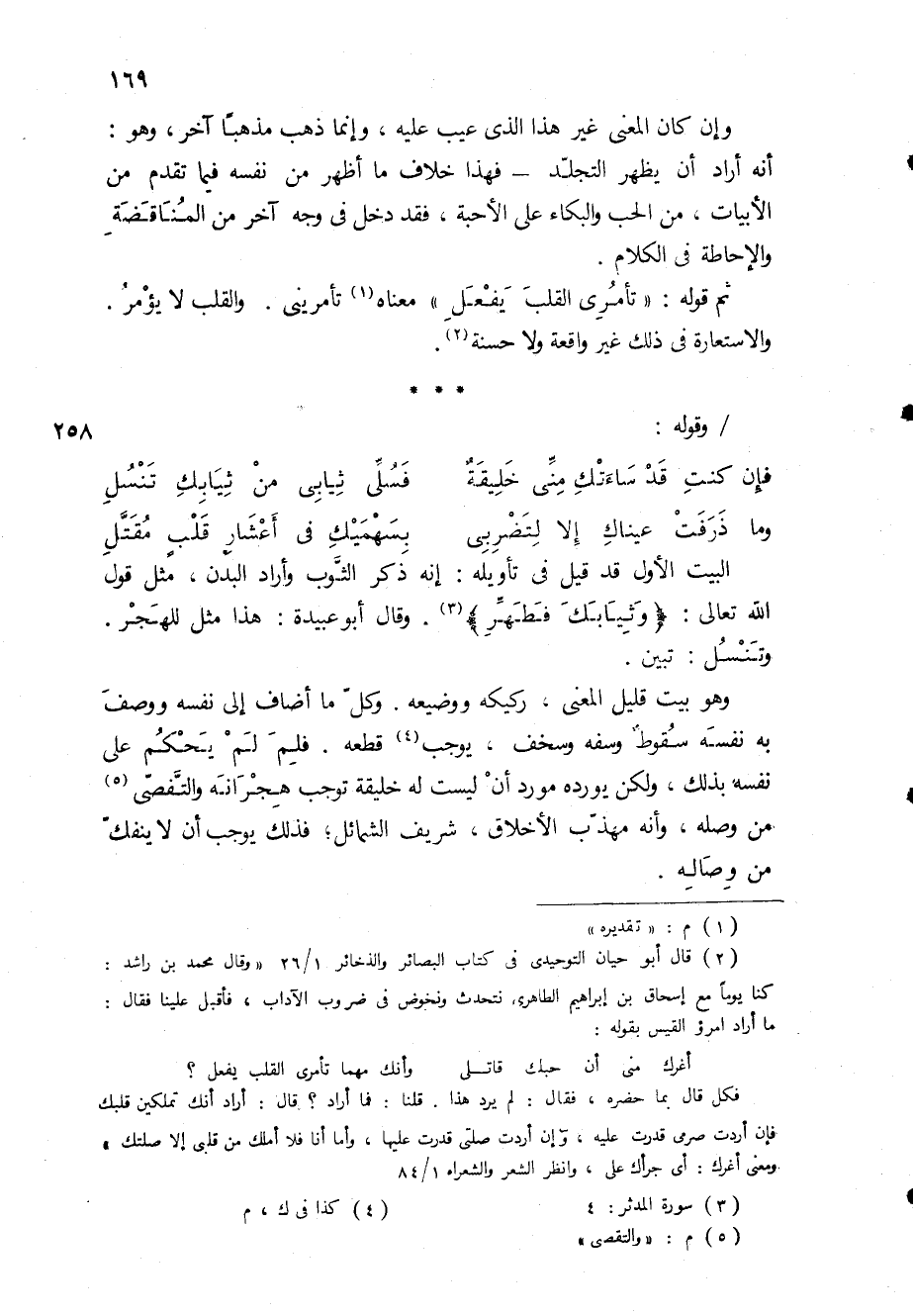 قلنا: فما أراد؟ قال: أراد أنك تملكين قلبك فإن أردت صرمى قدرت عليه، وإن أردت صلتي قدرت عليها، وأما أنا فلا أملك من قلبى إلا صلتك " ومعنى أغرك: أي جرأك على، وانظر الشعر والشعراء 1 / 84 (3) سورة المدثر: 4 (4) كذا في ك، م (5) م: " والتقصى " (*)