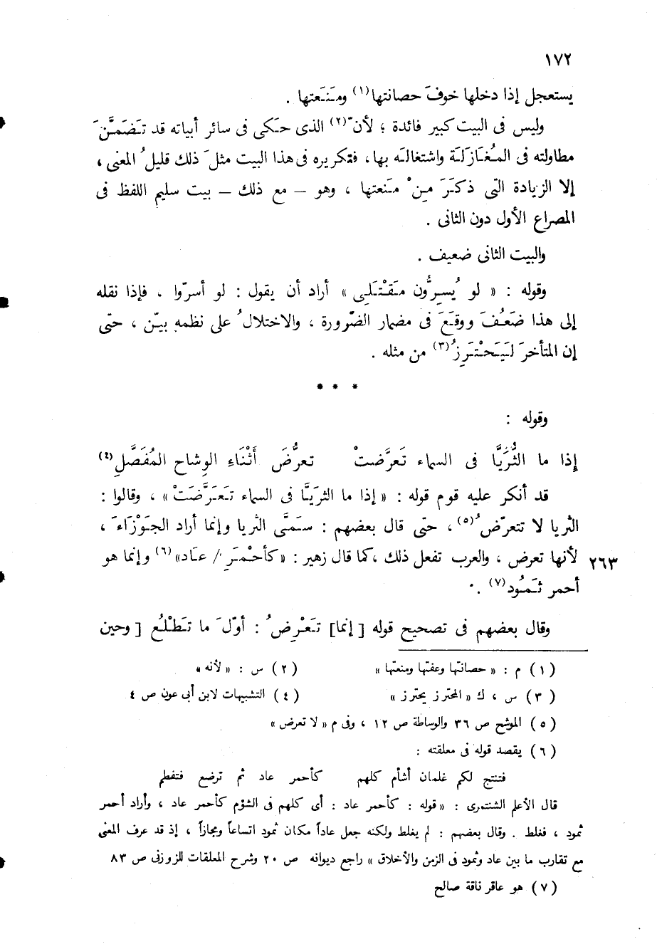 وقال بعضهم: لم يغلط ولكنه جعل عادا مكان ثمود اتساعا ومجازا، إذ قد عرف المعنى مع تقارب ما بين عاد وثمود في الزمن والاخلاق " راجع ديوانه ص 20 وشرح المعلقات للزوزنى ص 83 (7) هو عاقر ناقة صالح (*)