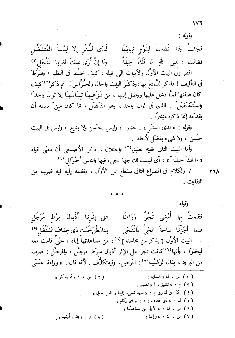 وقوله: فجئت وقد نَضَّت لنومٍ ثيابَها * لدى السِّتر إلا لبَسة المتفضِّلِ فقالت: يمينُ اللهِ مالك حيلة * وما إن أرى عنك الغواية تنجلي (1) انظر إلى البيت الأول والأبيات التي قبله، كيف خلط في النظم، وفرط في التأليف! فذكر التمتع بها، وذكر الوقت والحال والحراس - ثم ذكر (2) كيف كان صفتها لما دخل عليها ووصل إليها، من نزعها ثيابها إلا ثوبا واحد والمتفضل: الذي في ثوب واحد، وهو الفضل، فما كان من سبيله أن يقدمه إنما ذكره مؤخراً.