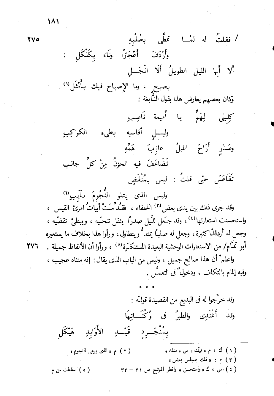 / فقلت له لما تمطى بصلبه * وأردف أعجازا وناء بكلكلِ: ألا أيها الليلُ الطويلُ ألا انجل * بصبح، وما الاصباح فيك بأمثل (1) وكان بعضهم يعارض هذا بقول النابغة: كليني لهم يا أميمة ناصب * وليل أقاسيه بطئ الكواكبٍ وصدر أراح الليلُ عازبَ همه * تضاعفَ فيه الحزنُ من كلِّ جانب تقاعسَ حتى قلتُ: ليس بمنقضٍ * وليس الذي يتلو النجوم بآيب (2) وقد جرى ذلك بين يدي بعض (3) الخلفاء، فقدمت أبيات امرئ القيس، واستحسنت استعارتها (4) ، وقد جعل لليل صدراً يثقل تنحيه، ويبطئ تقضيه، وجعل له أردافاً كثيرة، وجعل له صلباً يمتد ويتطاول، ورأوا هذا بخلاف ما يستعيره أبو تمام / من الاستعارات الوحشية البعيدة المستنكرة (5) ، ورأوا أن الألفاظ جميلة.