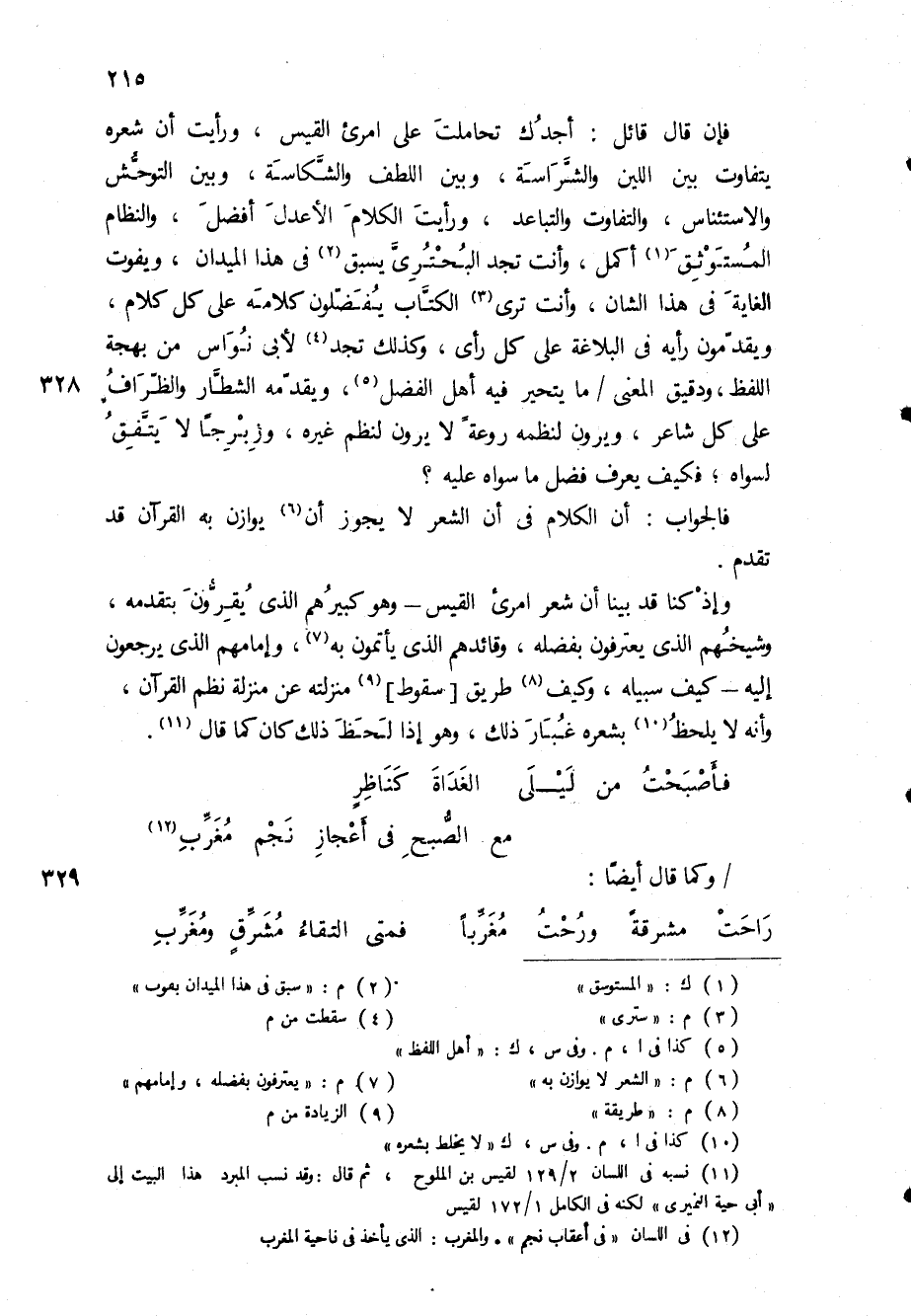 وإذ كنا قد بينا أن شعر امرئ القيس - وهو كبيرهم الذي يقرون بتقدمه، وشيخهم الذي يعترفون بفضله، وقائدهم الذي يأتمون به (7) ، وإمامهم الذي يرجعون إليه - كيف سبيله، وكيف (8) طريق [سقوط] (9) منزلته عن منزلة نظم القرآن، وأنه لا يلحظ (10) بشعره غبار ذلك، وهو إذا لحظ ذلك كان كما قال (11) .