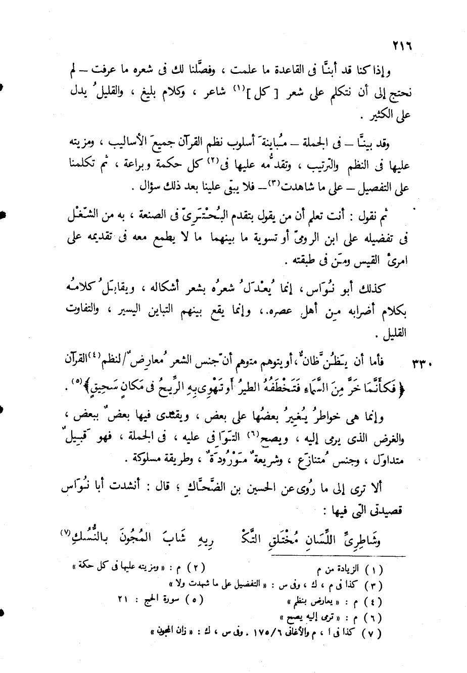 (1) الزيادة من م (2) م: " ومزيته عليها في كل حكمة " (3) كذا في م، ك، وفى س: " التفضيل على ما شهدت ولا " (4) م: " يعارض بنظم " (5) سورة الحج: 21 (6) م: " ترمى إليه يصح " (7) كذا في ا، م والاغانى 6 / 175.
